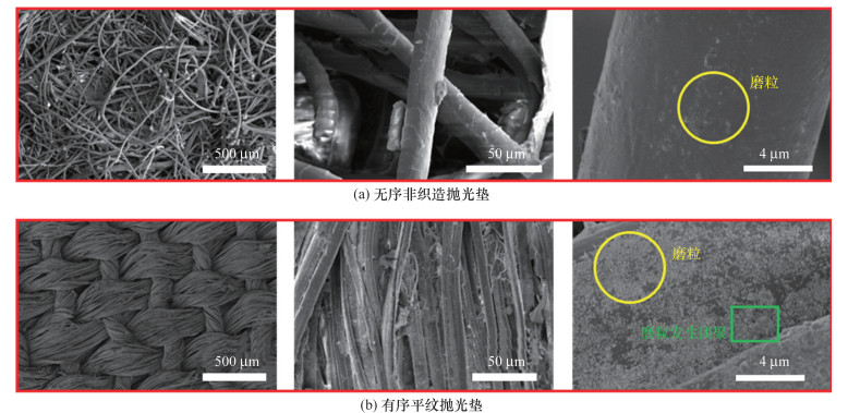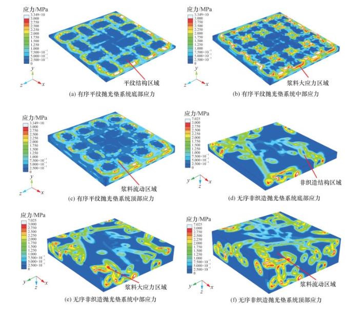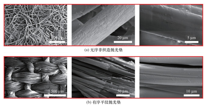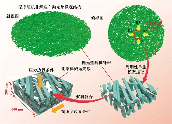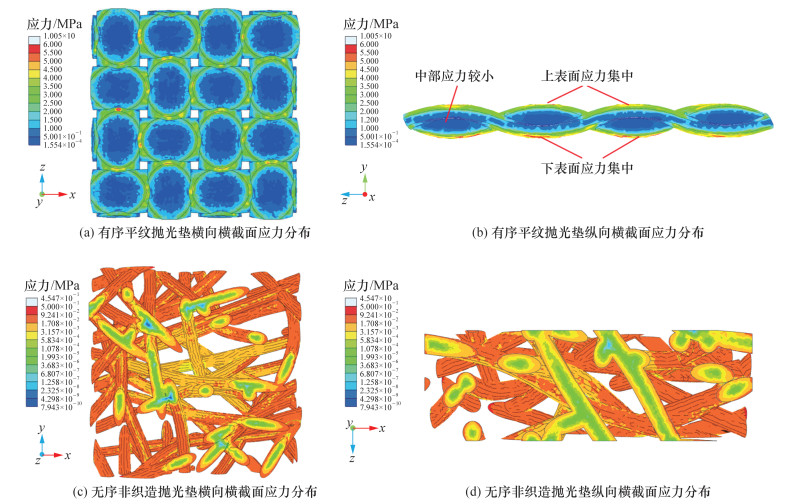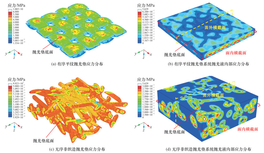 为深入理解抛光过程中抛光垫纤维结构、抛光液与工件间的相互作用机制, 该文构建了一种流-固耦合分析框架。通过综合实验验证与数值建模两大路径, 系统评估了有序平纹和无序非织造布抛光垫在抛光效能上的差异。针对熔融石英材料的超精密加工需求, 特制了一种绿色环保的抛光液, 其配方融合了氧化铈磨料、过氧化氢及瓜尔胶成分, 并在不同纹理的抛光垫(平纹与非织造布)上进行了应用测试。实验结果显示, 采用非织造布抛光垫的抛光后表面粗糙度Sa低至0.181 nm, 显著优于平纹抛光垫的0.486 nm; 同时, 前者导致的亚表面损伤层厚度也大幅减少至4.14 nm, 仅为后者的1/3(约12.12 nm)。进一步, 流-固耦合模型分析揭示, 非织造抛光垫在抛光过程中展现出更为均匀的纤维应力分布, 最大应力值仅约0.5 MPa, 远低于平纹抛光垫的6 MPa; 此外, 抛光液中的应力分布也趋于均匀, 这一特性优化了整体抛光系统内应力的传递与扩散效率, 促进了材料的均匀去除。综上所述, 本文不仅从实验与数值双重维度凸显了无序非织造抛光系统在熔融石英超精密加工领域的优越性, 更为纤维集合体抛光垫、抛光液与工件间复杂抛光系统的分析、设计乃至制造实践开辟了新的思路与方法。