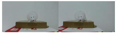 由于现有实验条件的限制,利用小鼠假体(头部最大直径D=37.36 mm,长度L=114.35 mm)代替真实小鼠(后文实验中提到的小鼠均指小鼠假体),并通过控制小鼠运动来模拟真实小鼠头部的自由运动。采集图像时,将小鼠放入透明圆桶(亚克力管,外径为80.48 mm,壁厚为1.97 mm,长度为119.96 mm)内,模拟真实的小鼠核医学成像环境。采用分辨率为1 280×720像素的双目相机(HBVCAM-W202011HD V33,深圳市汇博视捷科技有限公司)采集小鼠头部图像,如图 1所示。为了提高数据集质量,分别采集小鼠在不同姿态下的图像,如图 2所示。最终选取1 126张图像构建数据集,并划分为训练集(1 000张图像)和验证集(126张图像)。