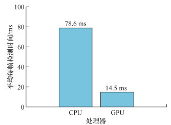 基于训练好的模型,使用不同的处理器对包含小鼠头部的视频进行检测,检测速度如图 3所示。使用CPU (Intel(R) Core(TM) i5-9300H 2.40 GHz) 对视频检测时,处理每帧图像平均需要78.6 ms,而使用GPU (NVIDIA GeForce GTX 1650)时,每帧平均需要14.5 ms。由于本研究的运动监测系统使用的双目相机拍摄视频的帧率为30帧/s(即相邻两帧图像间隔33.3 ms),为了满足检测实时性要求,选择GPU处理器进行特征点检测。在对小鼠头部特征点进行识别与定位的过程中,由于检测框为矩形,利用矩形几何性质计算检测框中心点的像素坐标,即小鼠头部特征点的中心像素坐标,