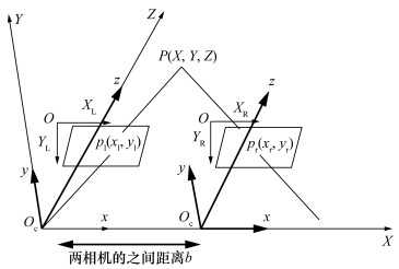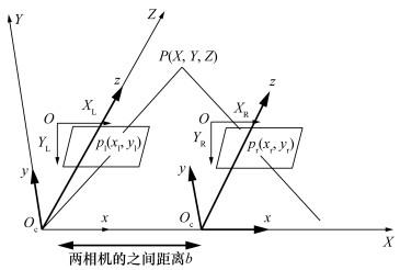 其中:$\left(X_{\mathrm{L}}, Y_{\mathrm{L}}, Z_{\mathrm{L}}\right)$,$\left(X_{\mathrm{R}}, Y_{\mathrm{R}}, Z_{\mathrm{R}}\right)$分别表示点P在左右相机坐标系中对应的三维坐标,fLfR分别为左右相机的焦距。