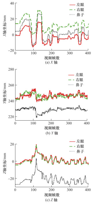 通过双目图像的三维重建可以获得小鼠头部的特征点在世界坐标系下随视频帧数变化的曲线,如图 5所示。