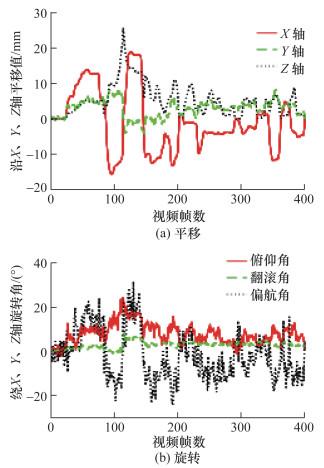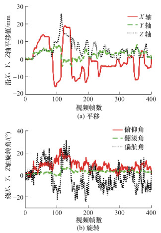 根据式(11)、(12)最终就能获得小鼠头部3个平移参数和3个旋转参数随视频帧数变化的曲线,如图 8所示。