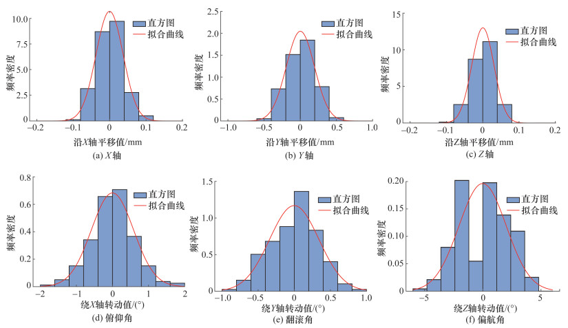 分析基于YOLO v5算法的小鼠头部位姿监测系统的静止实验结果可知,实验中所测量的沿小鼠头部坐标系XYZ轴方向平移参数的均方根误差分别为0.04、0.19、0.03 mm,测量的俯仰角、翻滚角、偏航角的均方根误差分别为0.58°、0.34°、2.03°。可见,测量结果较为精确,能满足核医学图像运动矫正的要求。但是,本文系统在测量小鼠头部偏航角时的精度略低,与文[25]使用双目相机测量人体头部姿态的结果相似。其原因是双目图像三维重建时Y轴重建误差比X轴和Z轴大,通过式(9)计算获得的偏航角精度也会变低。由图 9可知,实验中所测量的3个平移参数和3个旋转参数统计结果均符合正态分布,表明本文设计的运动位姿监测系统性能可靠。