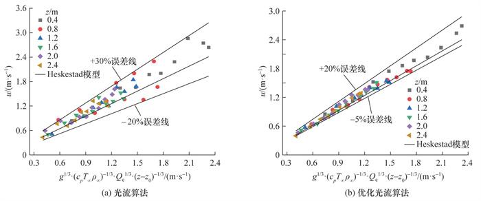 在火焰羽流速度测量上, 传统的测量方法依托Pitot管、感烟探针、热线风速仪等流场侵入式测量手段, 难以呈现整个羽流在时间和空间上的未受干扰的流动状态。为了观测到火焰羽流, 该文借助纹影对火焰羽流进行可视化。结合Navier-Stokes动量方程, 提出了一种适用于流场的优化光流测速算法。该算法在火焰羽流纹影图像上的测试结果比基本光流算法展现出更加平滑的光流场和更加均匀的涡度场, 在求解的过程中前几次迭代收敛速度更快, 最终获得的光流场精度更高。在火焰羽流测速实验中, 相比于基本光流算法, 该算法展现出更强的鲁棒性, 计算结果更接近Heskestad预测模型, 对火焰羽流速度的测量更加稳定和准确。