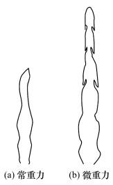 地面常重力环境中存在浮力对流,导致射流扩散火焰边缘出现大尺度的涡旋结构。实验和数值计算结果表明,上述结构是由于火焰面周围的高温燃气与环境交界面之间的剪切层发生了Rayleigh-Taylor不稳定性((R-T instability)和Kelvin-Helmholtz不稳定性((K-H instability)
