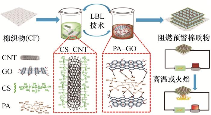 [36]通过壳聚糖(CS)分子与GO纳米片之间的静电相互作用,采用LBL技术在三聚氰胺(MF)泡沫上构建了智能纳米涂层,火焰响应时间仅为3 s,连续报警时间高达1 280 s。该项工作为生物基纳米涂料在火灾预警中的应用提供了新的思路。在GO中加入另一种导电填料如碳纳米管(CNT),可以进一步优化混合导电网络的性能,从而实现对响应时间的精确调控