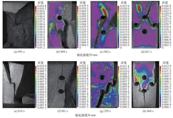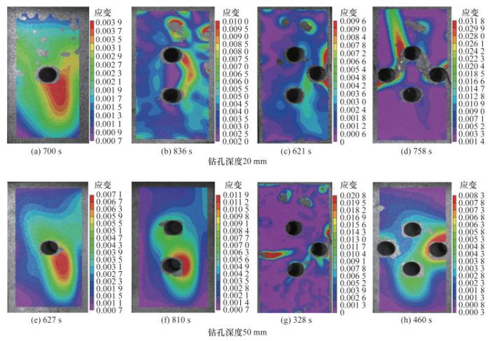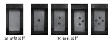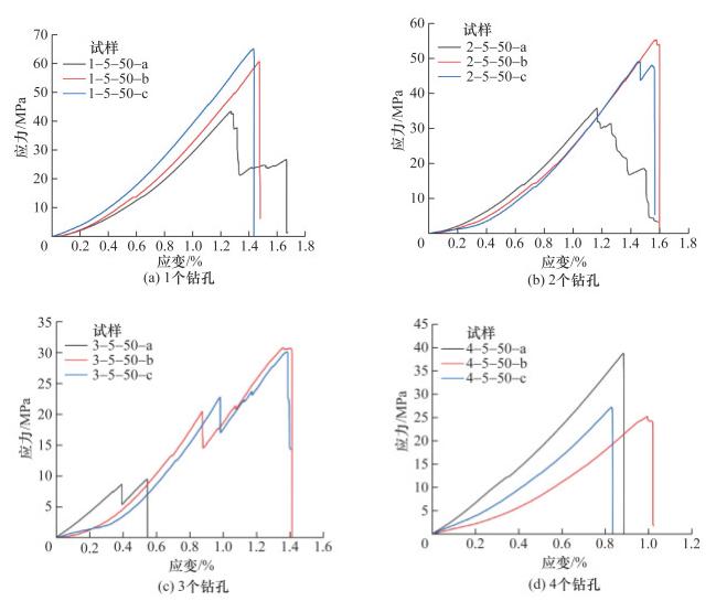 [25]通过单轴加载试验研究了不同钻孔深度或钻孔间距对试样力学特性的影响,表明随着钻孔深度增加和钻孔间距的减小,试样钻孔周围裂纹贯通会形成更大范围的卸压区,存在明显卸压效果。在钻孔数量和布置方式方面,Zhang等