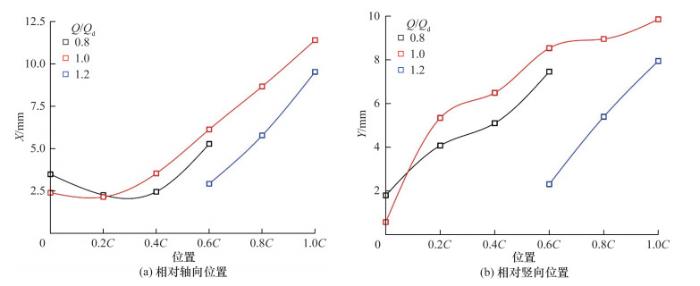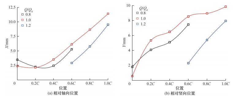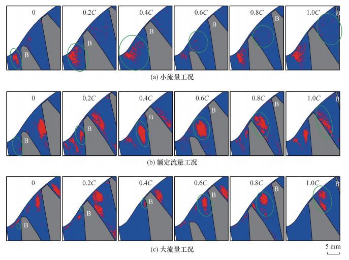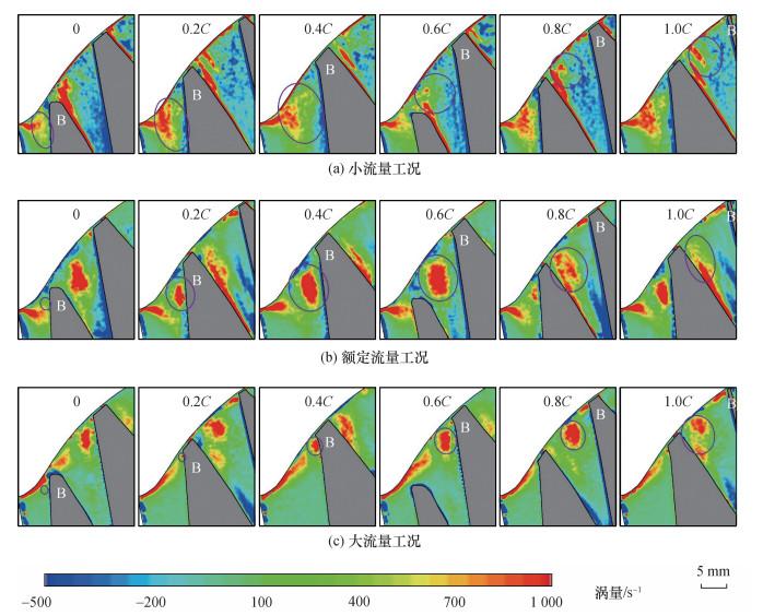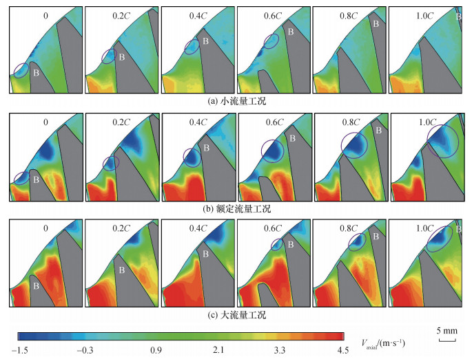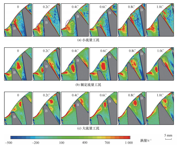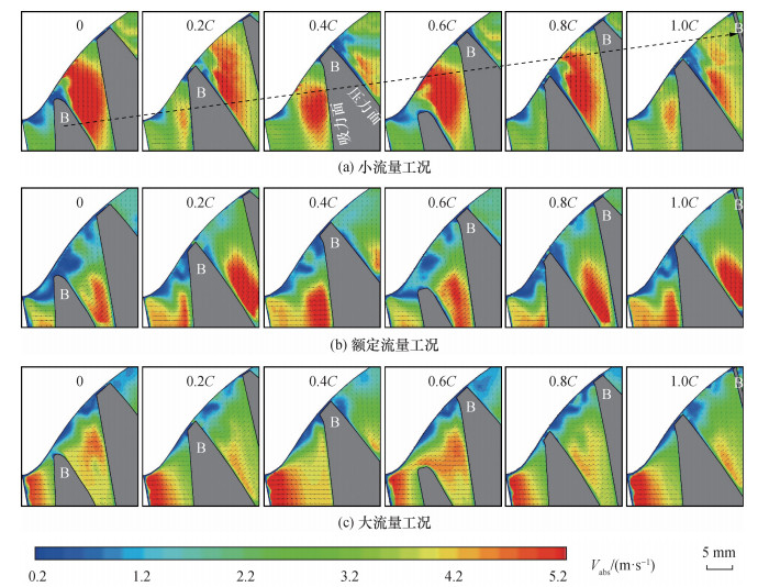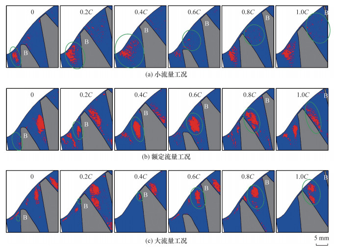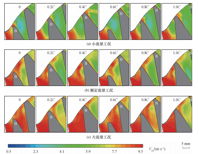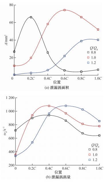 针对旋转叶轮叶顶间隙泄漏流试验测量和机理分析的难题, 该文提出一种基于全窗透明转轮室、等距弦长测量截面和旋转同步锁相的粒子图像测速(PIV)试验测量方法, 实现了混流泵叶顶间隙泄漏流的精细化试验测量。基于该方法, 搭建了水力机械综合性能试验台, 加工了一台比转速为484的混流泵, 系统测量了叶片头部到尾部6个测量截面上速度、涡量和涡结构分布。结果表明, 随着流量增加, 测量截面内相对速度逐渐增大, 额定流量下其方向与叶片型线基本一致, 验证了叶片水力设计的合理性。轴向速度随着流量增大而不断增大, 但受泄漏流影响分布逐渐不均匀, 叶片吸力面附近形成低速区, 并随泄漏涡向下游迁移逐渐偏离叶片。此外, 泄漏涡由泄漏流与主流剪切作用产生, 其面积和涡量从叶片头部到尾部均呈先增后减趋势, 面积峰值位置随流量增大依次迁移至30%、60%和80%弦长处, 涡量峰值则集中于40%~60%弦长区间。该研究揭示了叶顶间隙泄漏流的空间分布特征及其随流量的变化规律, 为混流泵优化设计与稳定运行提供了基础支撑。