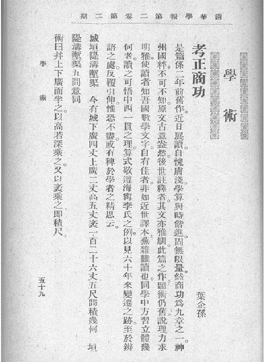 其中,叶企孙的三篇英文论文:一是引用《孙子算经》、刘徽《九章算术注》、秦九韶《数书九章》、李冶《测圆海镜》、王仁俊《政学问答》、沈括《梦溪笔谈》、梅文鼎《算器考》、寿孝天《改良算盘说》、华蘅芳《学算笔谈》、阮元《畴人传.方中通传》,考证算器的起源,并与日本学者商榷;二是分为周代数学、汉代数学、唐代数学、明代数学、康熙和梅文鼎、日本和阿拉伯数学等部分,论及周公、商高、《周髀算经》、《九章算术》、中国代数、割圆密率、四元、天元、地元、人元、物元、咸丰后李氏、华氏所译算书等,是我国学者用英文写的最早介绍中国数学发展史的论文;三是论及伏羲、干支、颛顼、尧、舜、盖天、浑天、宣夜、西士历算工作等。最具代表性的研究论文是《考正商功》,为叶企孙作为清华学校学生时即开始研究的课题,1915年秋季完成全文,对《九章算术》中“商功”做专题研究。该文是中国数学史现代研究的最早论文之一。该文序称:“此篇系两年前旧作,近日展读,自愧肤浅。学算与时皆进,固无限量。然《商功》为《九章》之一,神州国粹,不可不知。原文古意盎然,后世注释者,其文亦雅训。此篇之作,题术仍旧,说理力求明雅,使读者知我国数学文字自有佳者。同学中习立体几何者,读之可知中西一贯之理。”他将全部问题分为柱体、锥体、截头锥体、斜截正柱体四类,都用现代方法给出演算与证明,但“算式敬遵海宁李氏之例”,即采用了清末著名数学家李善兰创制的数学符号。其中对城垣堤沟堑渠 、堢壔、堑堵、方锥、阳马、圆锥、鳖臑、方亭、圆亭、刍甍等题的演算与论证都是正确的。他对刍童、盘池、冥谷、曲池、刍甍等题也给出演算过程并加以证明,但在理解《九章》原意上有误解。他错误地认为刍童是“上狭而下广,盘池、冥谷上广而下狭,然皆长方底之截头锥体也”。因而得出结论:“《九章》所为刍童、盘池、冥谷者,其亦截头锥体乎,乃并观之,而《九章》之谬显矣”[5] 。审校者梅贻琦对该文进行了验算、复核后,对此作了纠正:“至於刍童、盘池、冥谷,仅为平行底之立体,而亦非斜截头体,尚不可不察焉。”他正确地指出:“实则方亭为刍童之一种,而刍童则包罗方亭与截锥而有之。盖苟使上袤等上广,下袤等上广,则得方亭,而使上袤下袤及上广下广成比例者,则得截锥也,故方亭截截之算式,均可于刍童式中化出” 。梅贻琦当时在清华担任物理教师,是叶企孙的老师。他虽然指出了叶企孙的这一误解,但也肯定了叶企孙研究工作的重要价值:“叶君疑问之作,皆由于原书中‘刍童、盘池、冥谷皆为长方底之截锥体’一语之误。然叶君能反复推测,揭破其误点,且说理之圆足,布置之精密,俱见深心独到之处。至可喜也”[5] 。