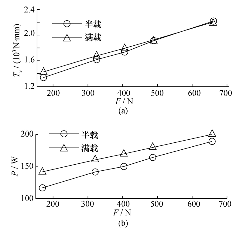 3.2.1 预张力和负载根据发动机的怠速转速,设定主动轮转速为 800 r/min。在该转速下,不同预张力F和负载TL下系统的阻力矩Ts与功率损失P的变化如图4所示。