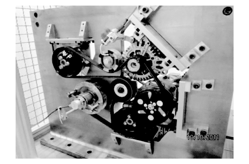 4 台架试验为了验证本文仿真模型和方法的正确性,在实验室进行了台架试验。考察指标选择预张力、打滑率、系统固有频率、系统阻力矩或各带轮的转速等。