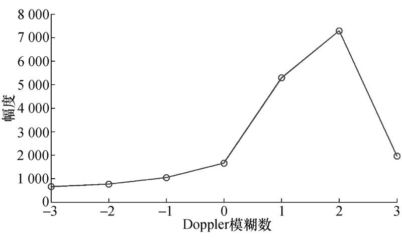 当目标vr未知时,回波数据经处理变换到二维时域,计算二维数据在表1中7个先验角度的Radon变换值,峰值对应的即为所求Doppler模糊数。