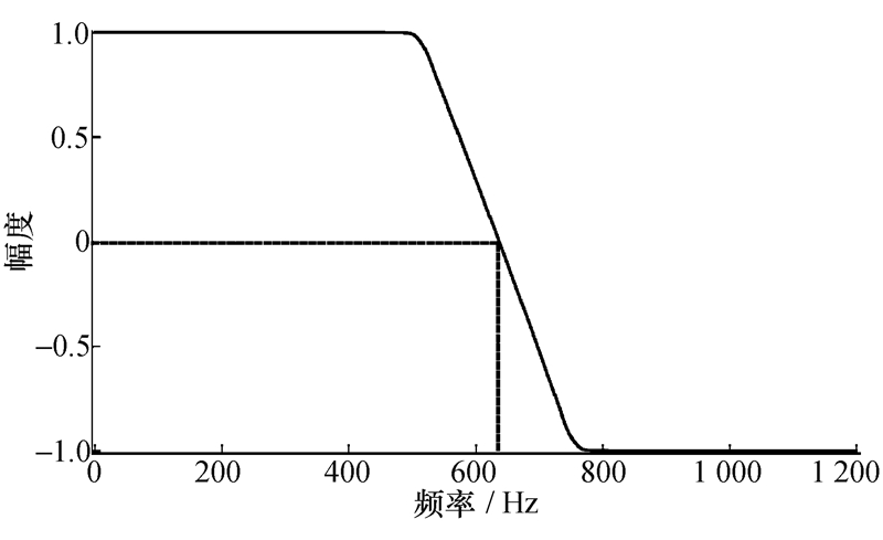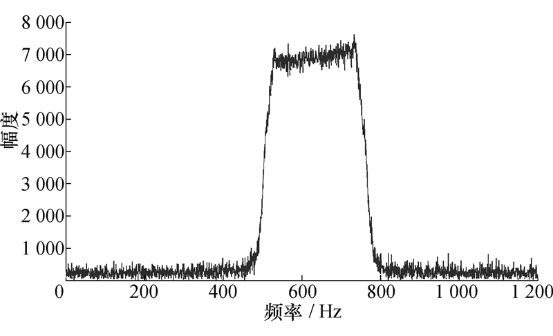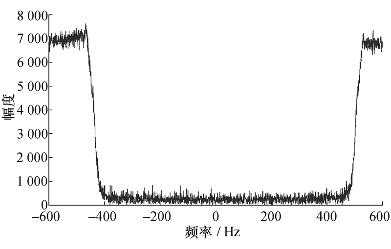 从图2可得,此时的Namb=2,下面求基带Doppler中心频率。经过Fourier变换到距离Doppler域,并利用基于幅度的方法求得Doppler频谱序列,此时横坐标是[-fPRF/2,fPRF/2],如图3所示。经过DSD检测后,发现频谱分裂,将频谱进行搬移拼接,并将横坐标转换为[0,fPRF],如图4所示。对图4中的Doppler频谱序列应用EBA求左右能量均衡点即f'd0,如图5所示。根据EBA可以求得 f'd0=636.88 Hz,由于f'd0∈[fPRF/2,fPRF],则有fd0=f'd0-fPRF]=-563.12Hz。故根据式(10)得到fd=1 836.88 Hz,并根据式(9)得到 vr=27.55 m/s,在误差允许的范围内,该估计值是准确的。