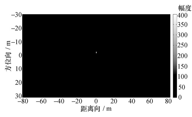 在距离向压缩之后的距离Doppler域,提取目标的轨迹,根据WVD和RT结合的方法估计目标的Ka,其结果为Ka=208.99 Hz/s。已知Ka后,可得方位向频域匹配函数,从而进行方位向脉冲压缩,得到如图6的最终聚焦图。由目标在场景中心故可知R0=5 000 m,根据式(19)可得va=-5.20 m/s,在误差允许的范围内是准确的。
