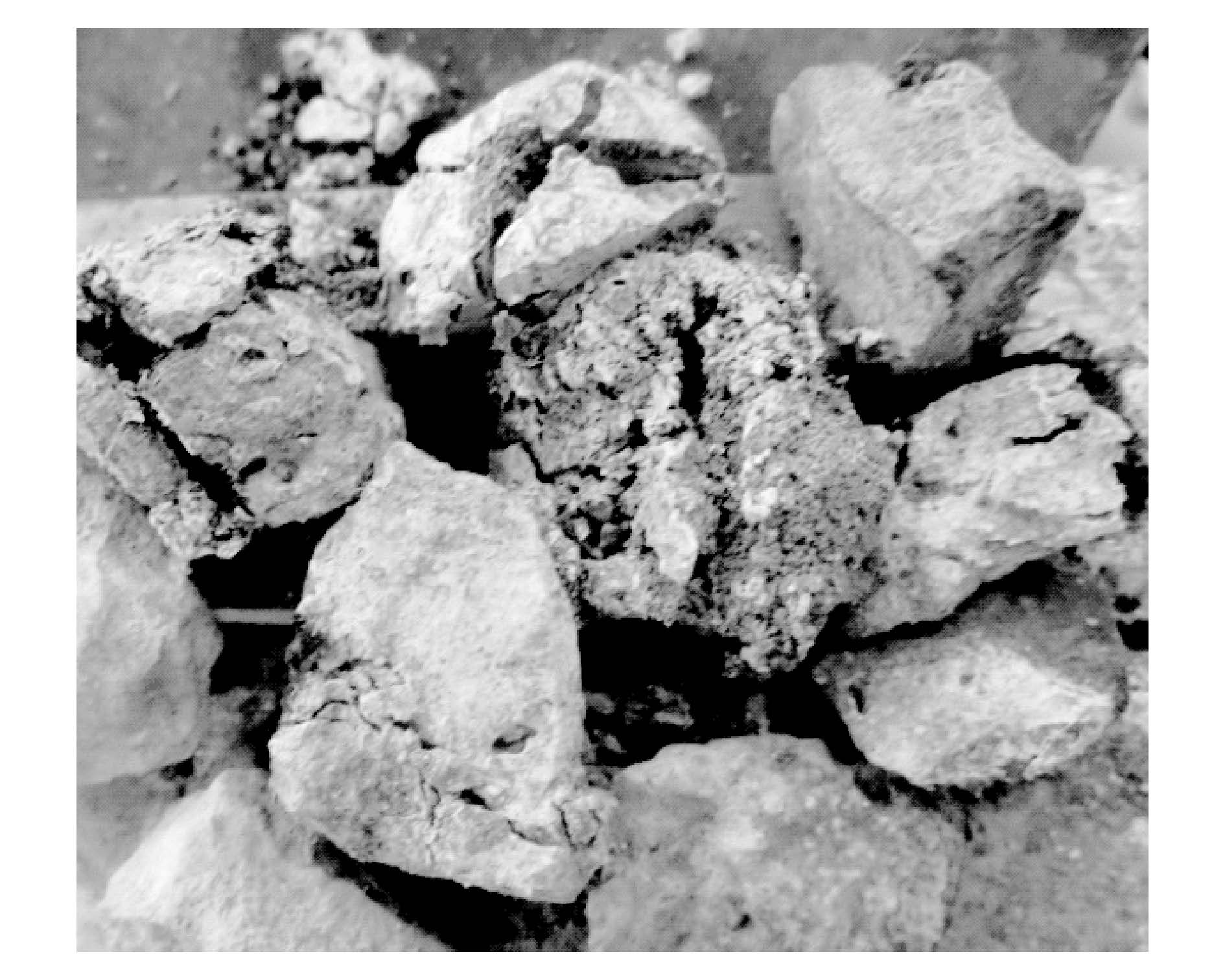 2 结果与讨论 2.1 压蒸条件下钢渣骨料的反应钢渣骨料压蒸3 h后的状态如图1所示,有些骨料发生了开裂,有很多骨料发生了粉碎。钢渣骨料的强度高,因而可知钢渣骨料在压蒸的过程中,内部产生了很大的膨胀应力,以致骨料开裂或粉碎。可以推测,在硬化混凝土中,钢渣粗骨料受周围水泥硬化浆体的约束,没有自由膨胀的空间,因而会对硬化浆体产生较大的膨胀应力。