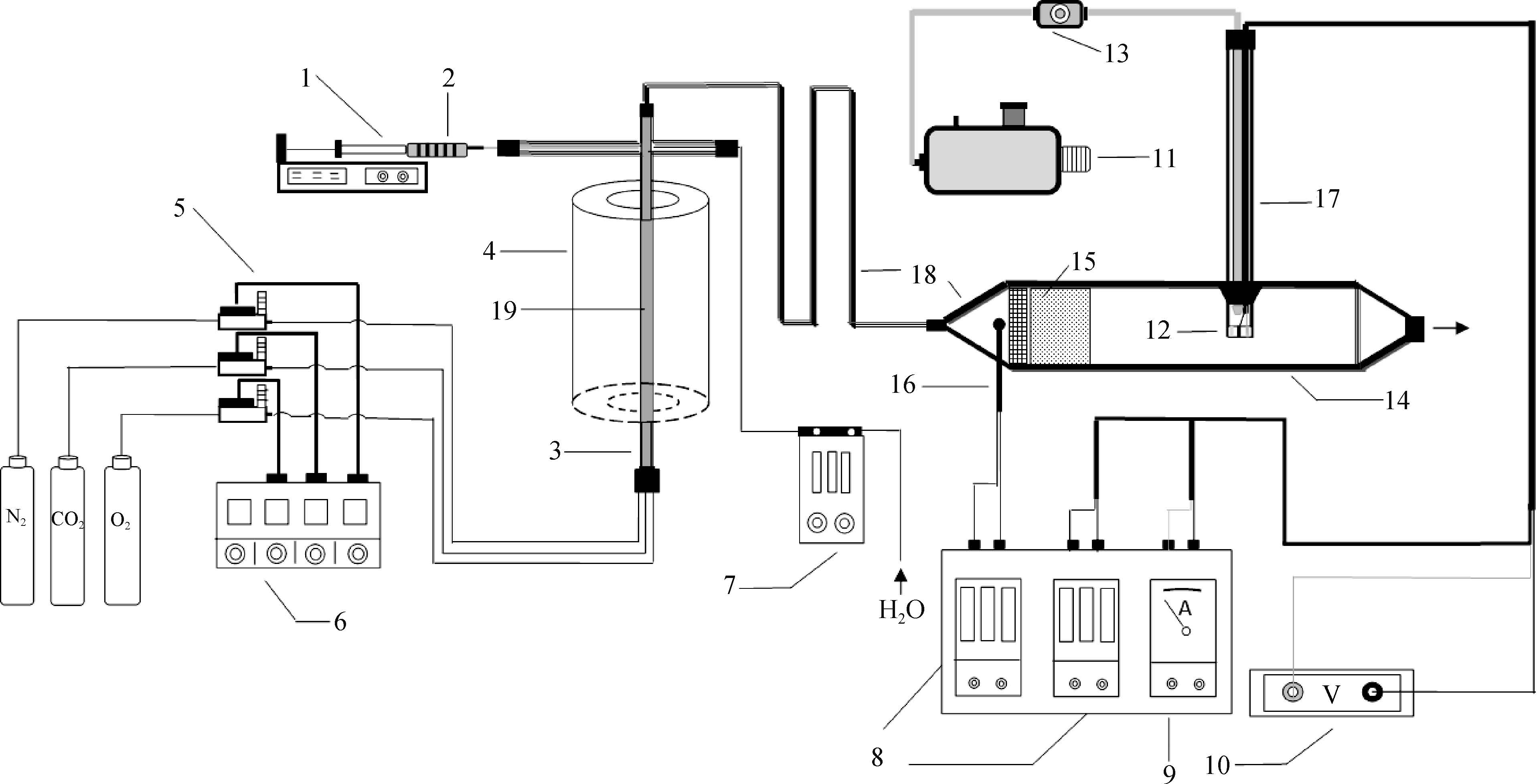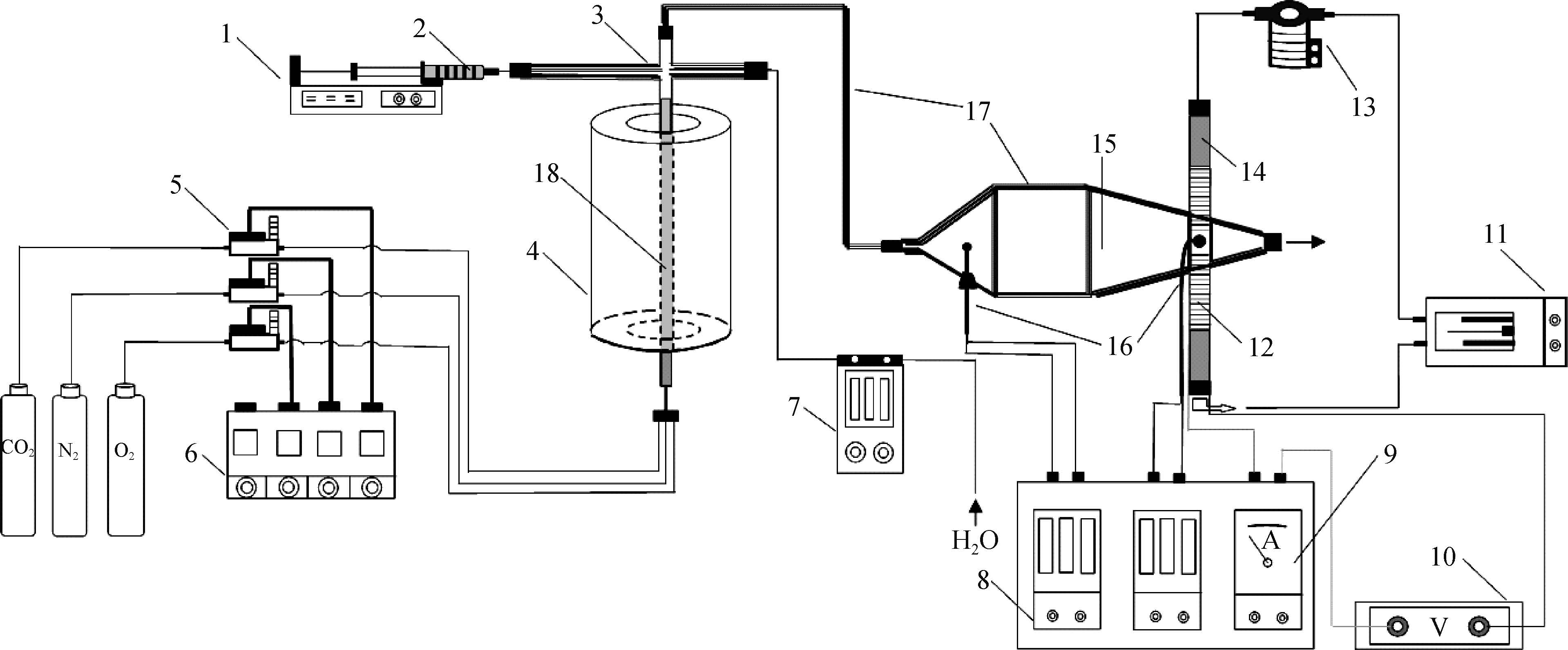 | 1—微量注射泵;2—2.1%的硫酸;3—石英玻璃管;4—管式炉;5—质量流量计;6—质量流量计控制表;7—蠕动泵;8—温控表;9—电流表;10—直流电源;11—恒温水箱;12—电极;13—循环泵;14—电木管;15—烟气箱;16—热电阻;17—保温棉和加热带;18—蓄热小球 图 1 抽气式测量实验系统示意图 |
