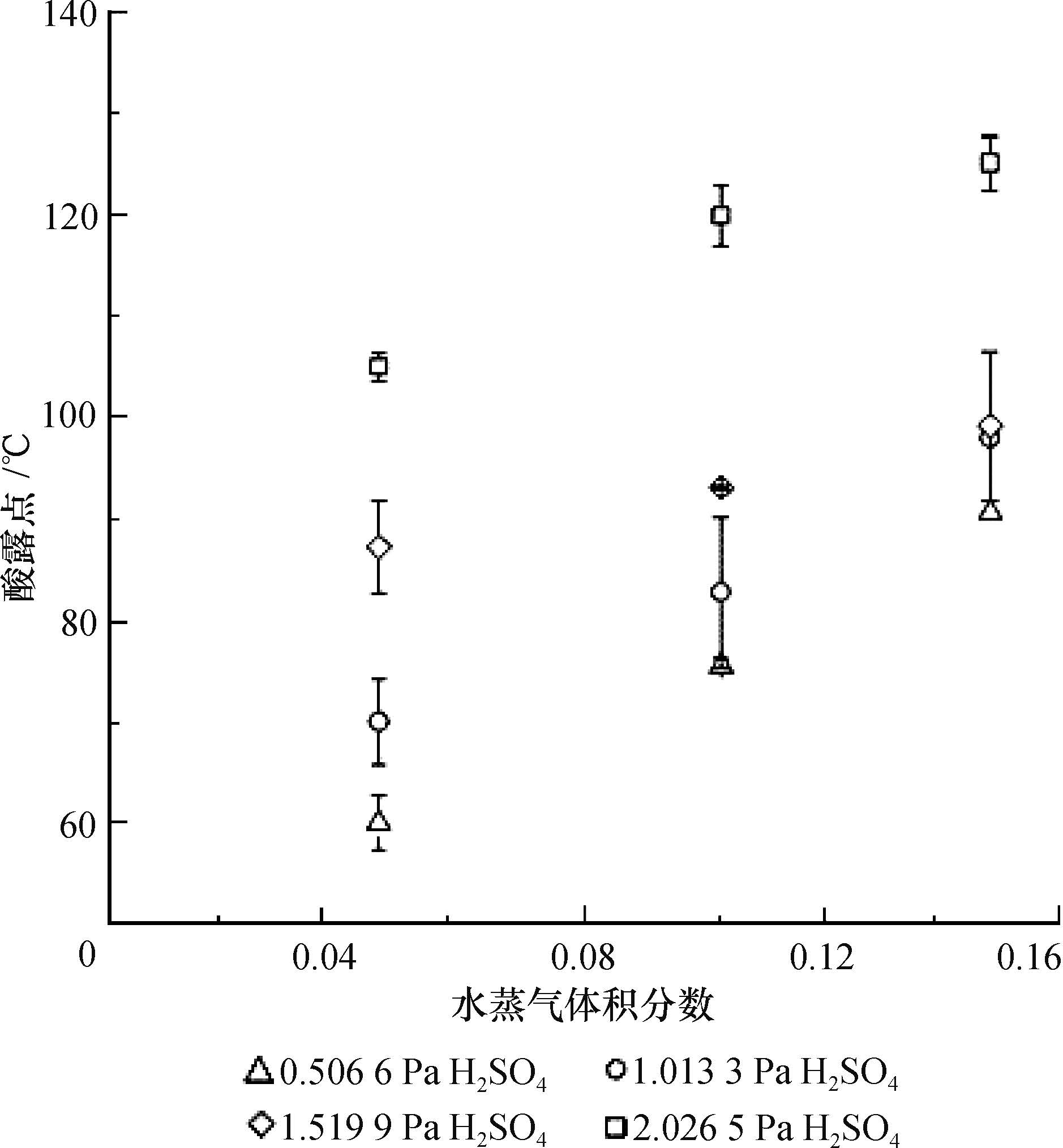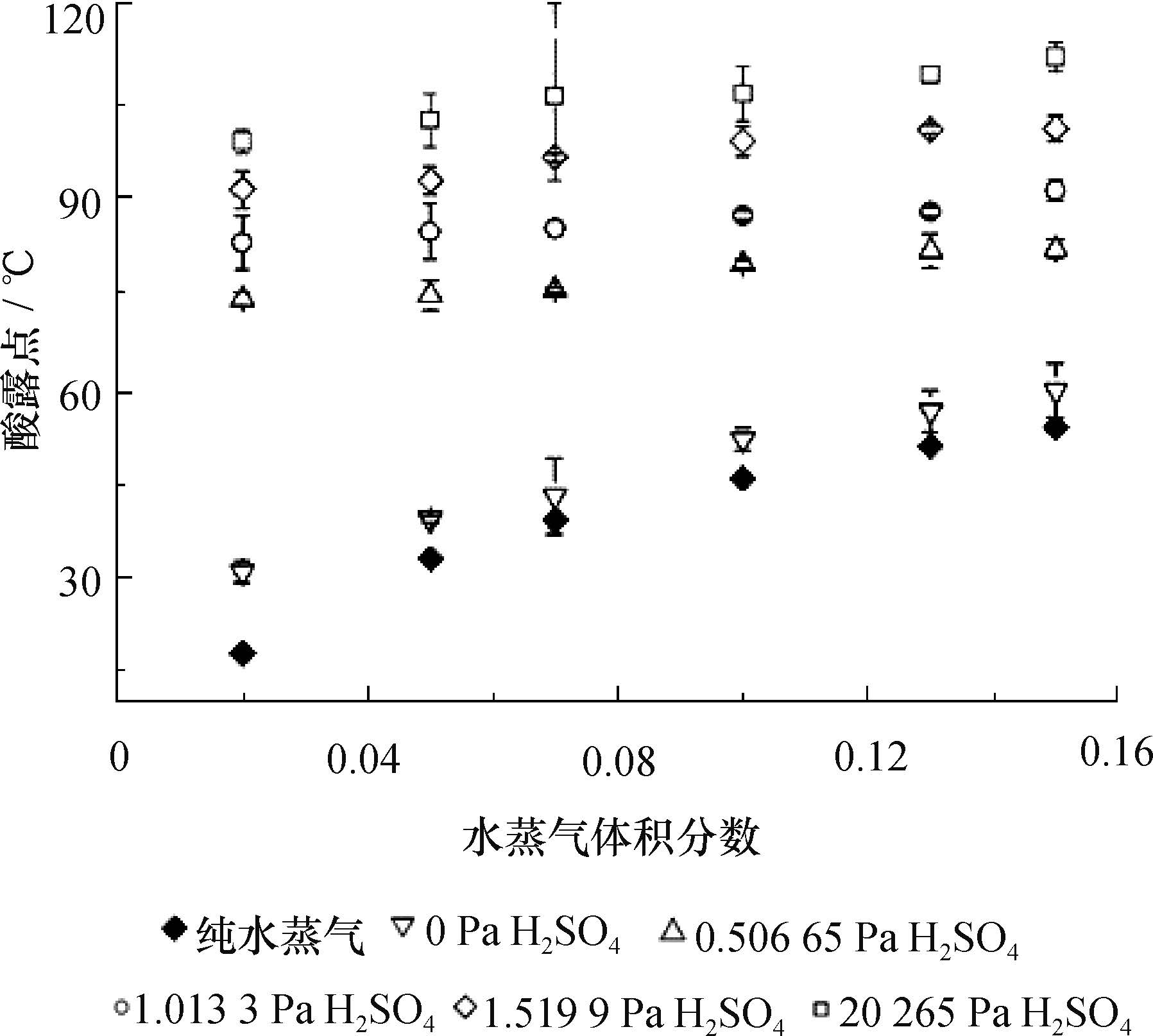 2.3 测量结果采用抽气式测量装置对不同烟气工况酸露点测量的结果见图5,其中不含酸蒸气时的纯水蒸气的露点通过查《水和水蒸气的热力性质表》得出[17]。图5表明当烟气中含有酸性气体CO2时,烟气露点较纯水蒸气露点明显增加,而一旦烟气中含有硫酸蒸气,烟气露点较碳酸露点则增加非常明显。此外,随着烟气中硫酸蒸气分压的增加,烟气酸露点随硫酸蒸气分压和水蒸气分压的变化趋势逐渐减缓。类似地,随着烟气中水蒸气分压的增加,烟气酸露点随水蒸气分压变化也逐渐减缓。采用插入式测量装置对不同烟气工况酸露点测量的结果见图6。对比图5和6表明插入式与抽气式测量装置测量结果的规律基本一致。