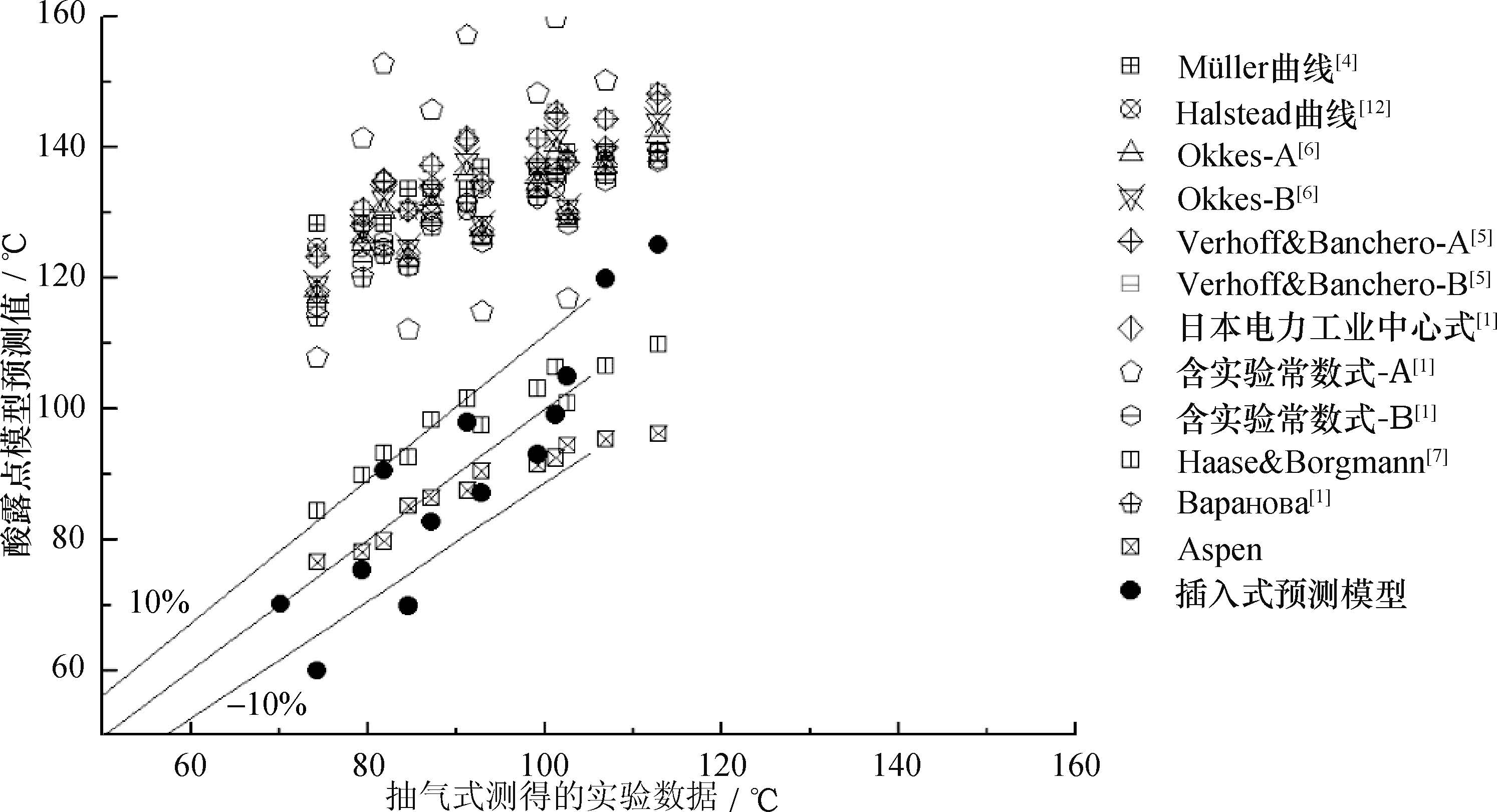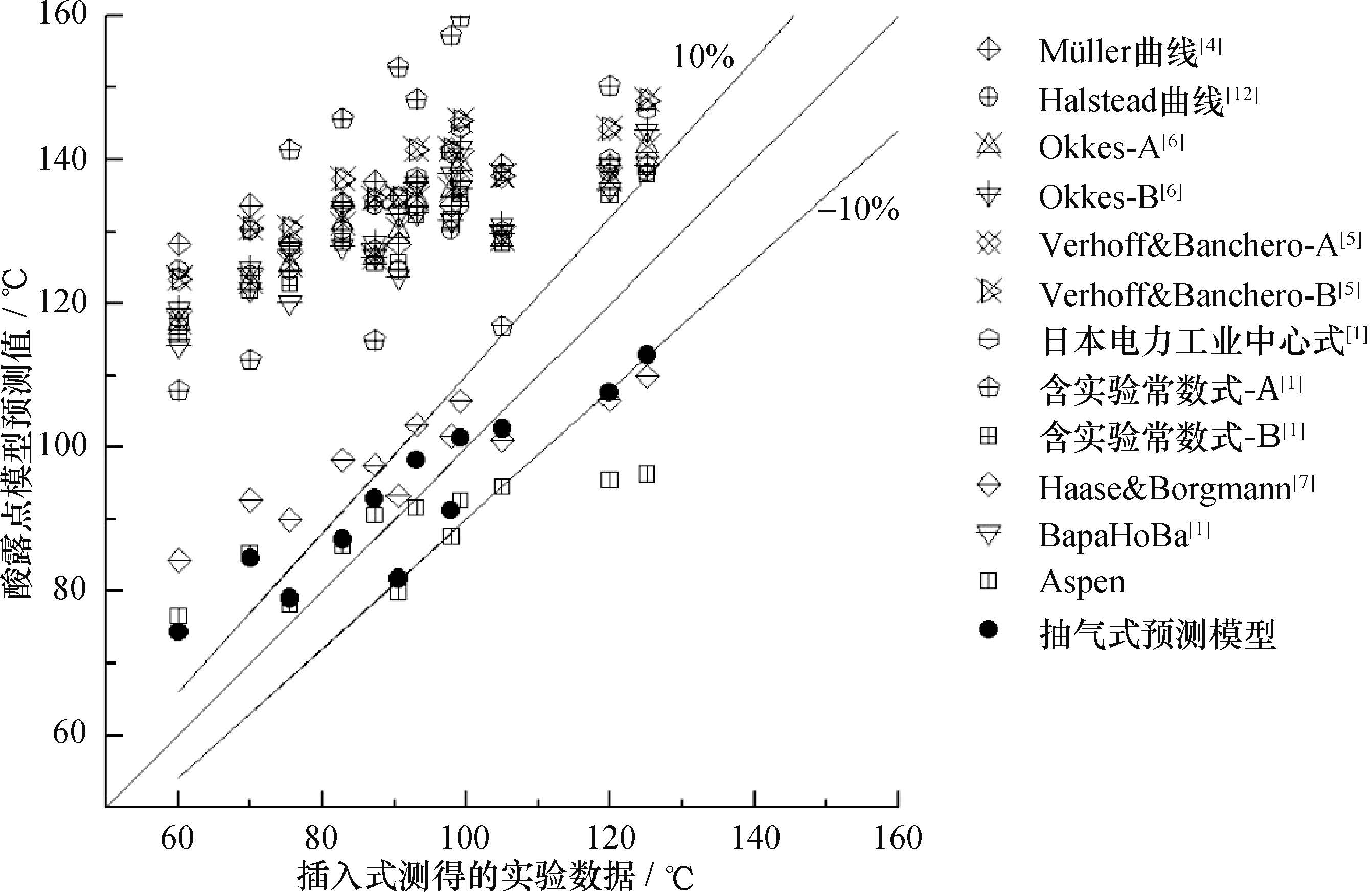 图7是将同样烟气条件下基于抽气式测量实验结果推导的酸露点模型与文献中的其他预测模型的计算结果、插入式测量实验结果进行对比。类似地,图8是将同样烟气条件下基于插入式测量实验数据推导的酸露点模型与文献中的其他预测模型的预测结果、抽气式测量实验结果进行对比。对比结果表明,除Haase等提出的预测模型和Aspen模型之外,目前基于烟气酸露点与其影响因素之间热力学关系式和实验数据建立的半经验预测模型的预测结果普遍偏高。