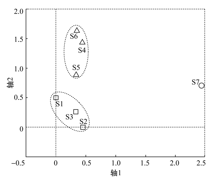 图 2给出了7个采样点的DCA排序图,这7个点明显被分为3组: 第一组(S1、 S2、 S3),第二组(S4、 S5、 S6),第三组(S7)。由图 2可见,这3组的底栖动物群落结构存在差异。对于第一组,S1和S2位于支流糯有河,S3位于主流靠上游,3个点控制面积内橡胶林种植面积比例为1.4%~4.7%,河水透明度高; 第二组S4、 S5和S6位于中游,控制面积内橡胶林种植面积比例为5.6%~9.9%,河水透明度较高; 而第三组S7靠近下游,控制面积内橡胶林种植面积比例为14.7%,该点水质浑浊,河水透明度最低(表 1)。可见,从第一组样点到第三组样点控制面积内的橡胶林种植强度逐渐增加,底栖动物组成能很好地反映样点的环境状况: 环境条件相似的样点中,底栖动物组成也相似。