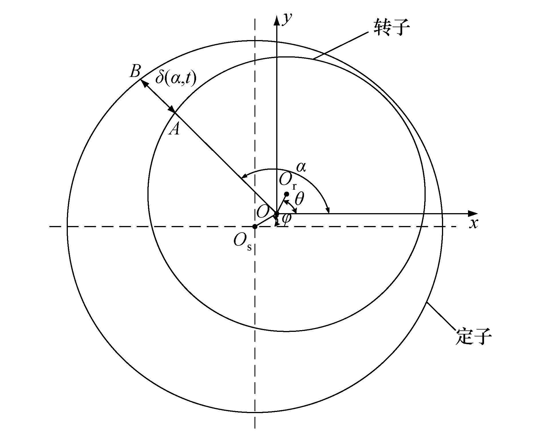 设A、 B分别为转子外圆和定子内圆上的点,则OA、 OB的长度分别为: