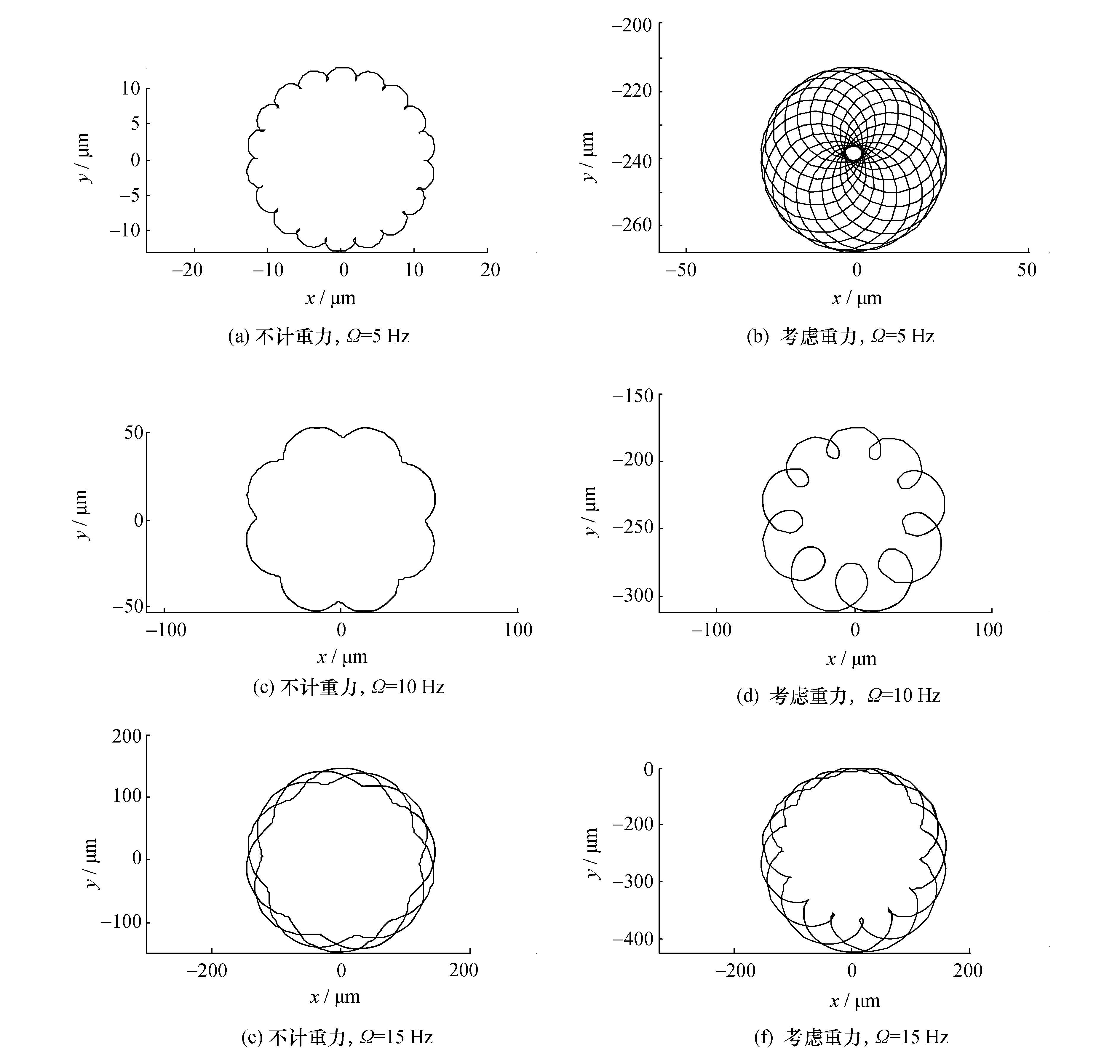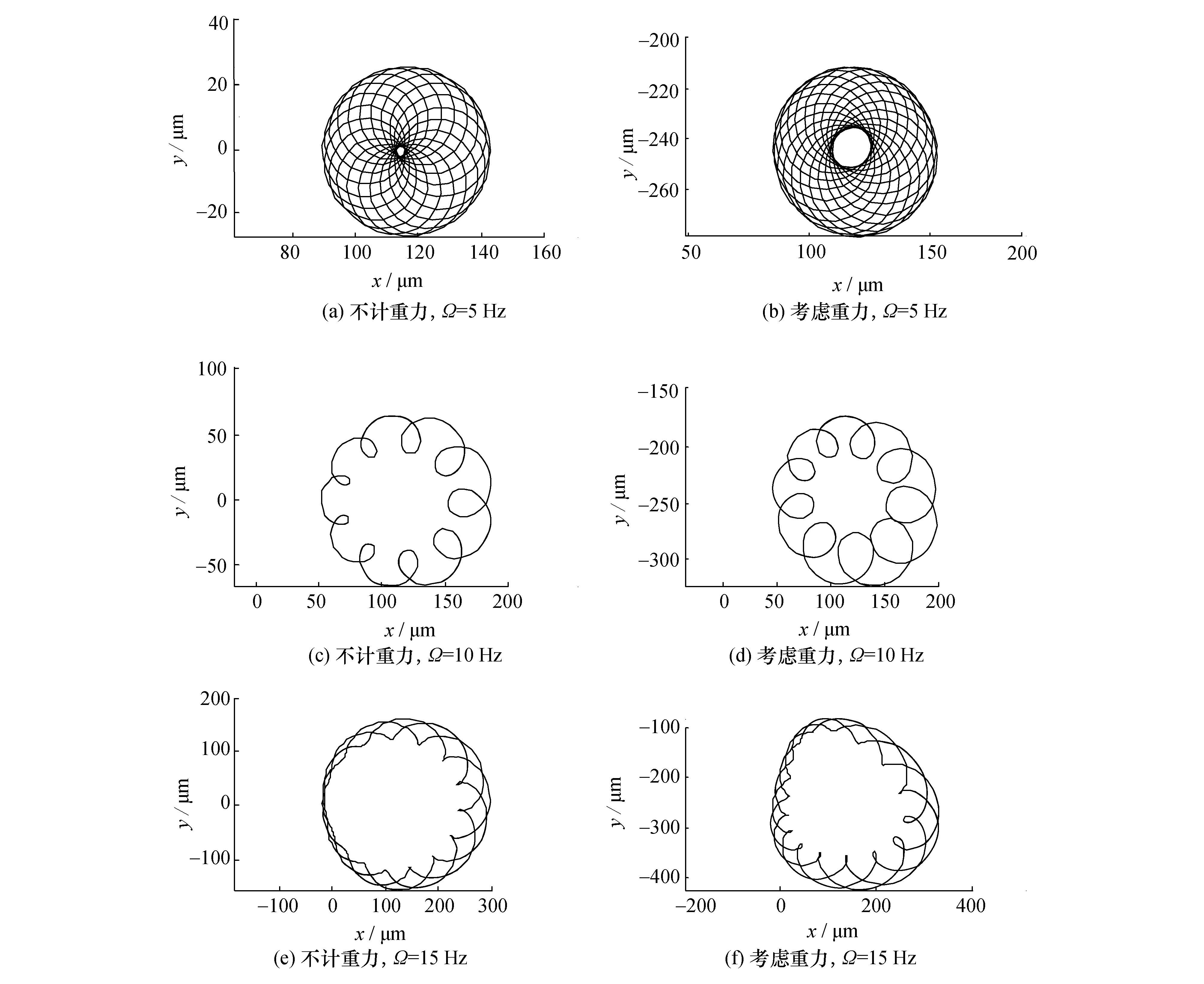 | 图2 不同转速下重力对动偏心转子轴心轨迹的影响 |