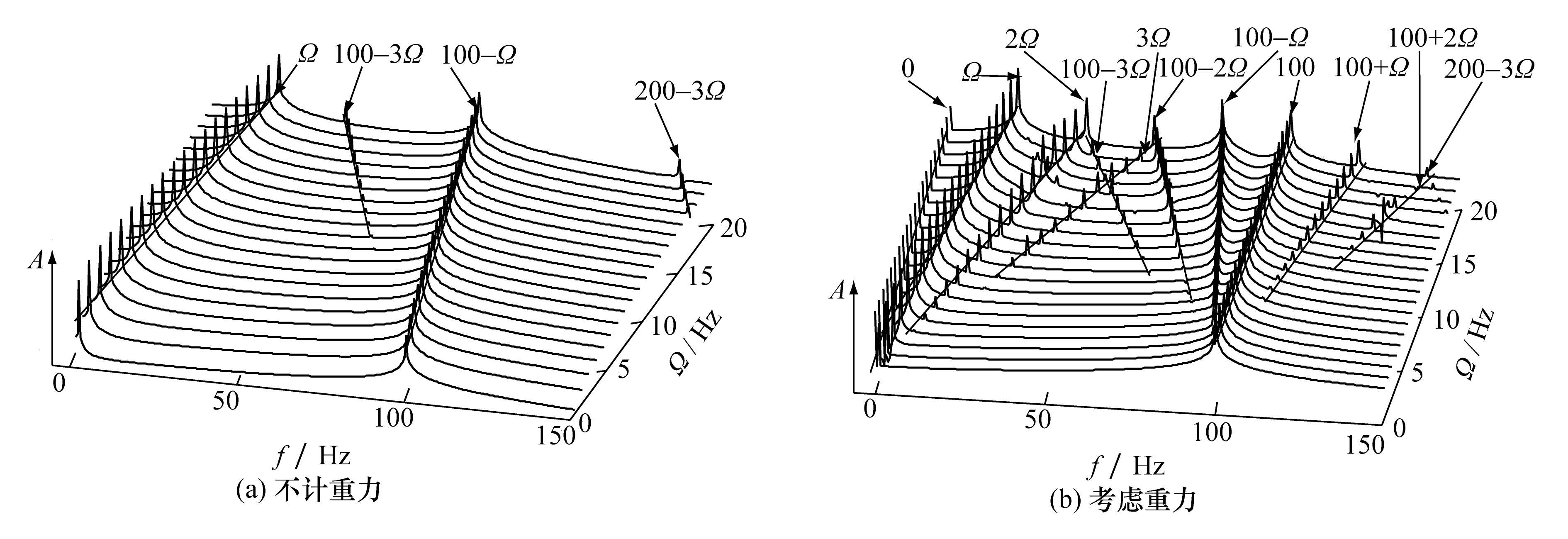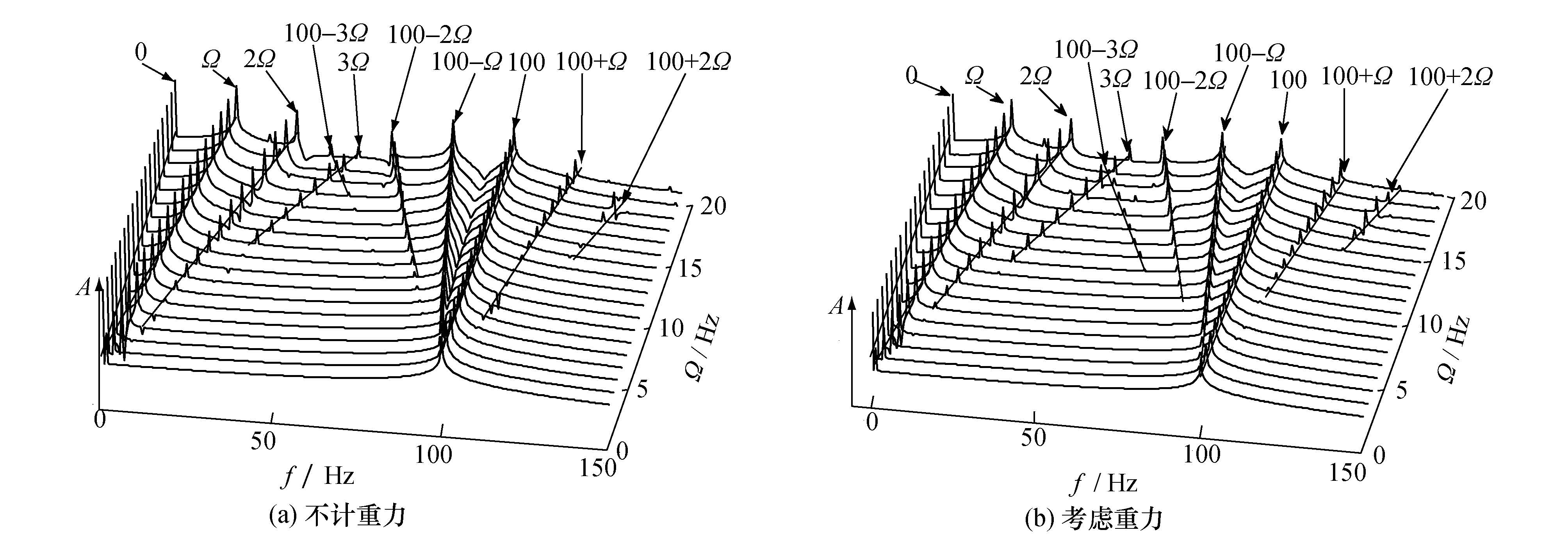 进一步,如图3所示,对不计重力和考虑重力两种情形下不同转速时的位移频谱进行分析。为便于观察比较,将位移幅值A取对数后进行3维瀑布图分析。