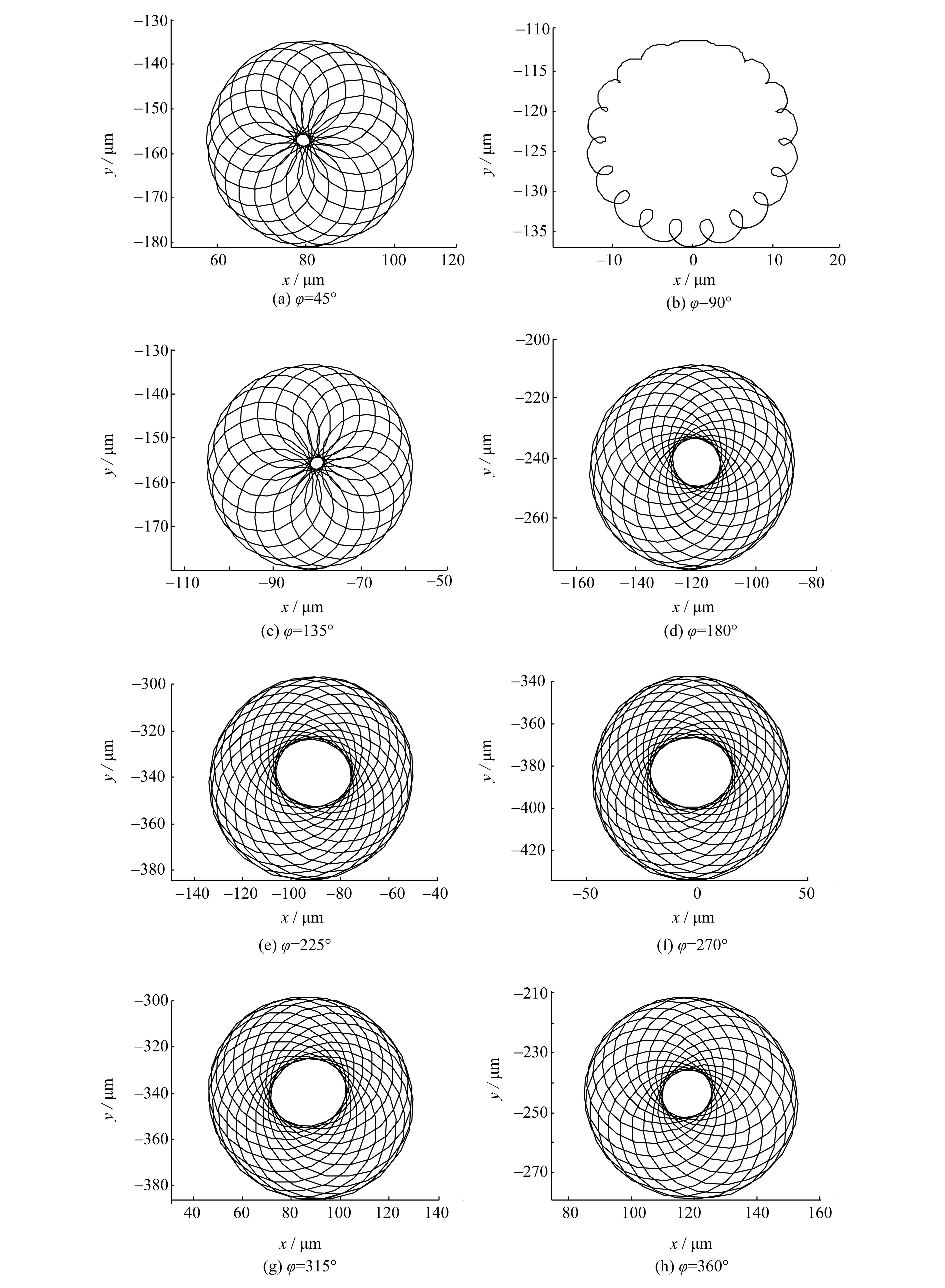 2.3 静偏心方向对转子系统振动的影响由于初始静偏心方向的不确定性,有必要研究静偏心方向对转子系统振动的影响。在工程实践中,偏心的方向可能是任意的,为便于分析,将圆周360°均分为8个区间,间隔为45°,在转速Ω=5 Hz、 静偏心率r0/δ0=5%和考虑静载荷(重力)作用的条件下,分析不同偏心方向角对转子系统轴心轨迹的影响,结果如图6所示。
