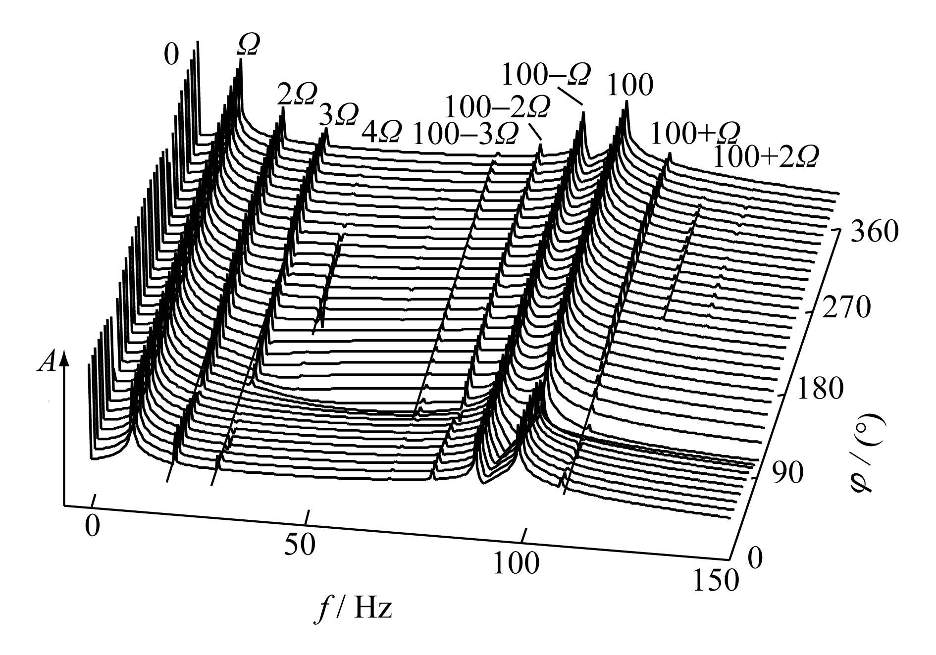 由图7可知,随偏心方向角的变化,位移频谱中出现了周期性特征。0 Hz频率分量在偏心角为90°和270°时最小,在180°和360°时最大,呈现出简谐周期函数的特征,且周期为180°。频率成分Ω和100-Ω的幅值不随偏心方向角变化,而2 Ω、 100-2 Ω和100 Hz的幅值呈现出先减小后不变的特征,在偏心方向角为90°时最小,缓慢增大后保持不变。频率成分为3 Ω和100+ Ω的幅值则是先减小后增大,90°时幅值最小,270°时幅值最大,表现出较强的周期性。偏心角为180°~270°时,激发出频谱中4 Ω的频谱成分,偏心角为180°~360°时,频谱中出现幅值较小的100+2 Ω成分。