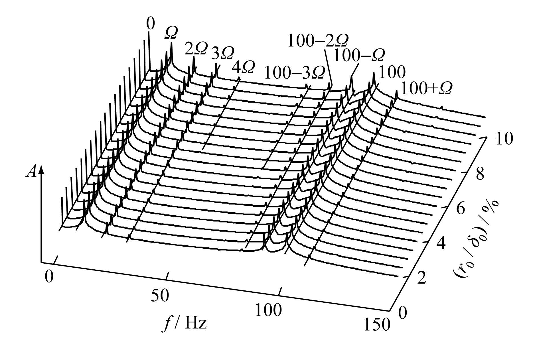 2.4 静偏心量对转子系统振动的影响初始静偏心将引起转子气隙分布不均,形成不平衡磁拉力。针对转子动静复合偏心的情形,考虑静载荷(重力)作用,讨论在一定转速下如Ω=10 Hz,静偏心方向x轴正向时,不同静偏心量对位移频谱的影响。工程中静偏心率(r0/δ0)一般为10%以下,本文从1%~10%逐一分析偏心量变化时振动位移频谱的特征,结果如图8所示。限于篇幅,只分析静偏心量对位移频谱的影响,轴心轨迹的变化规律可类似分析。