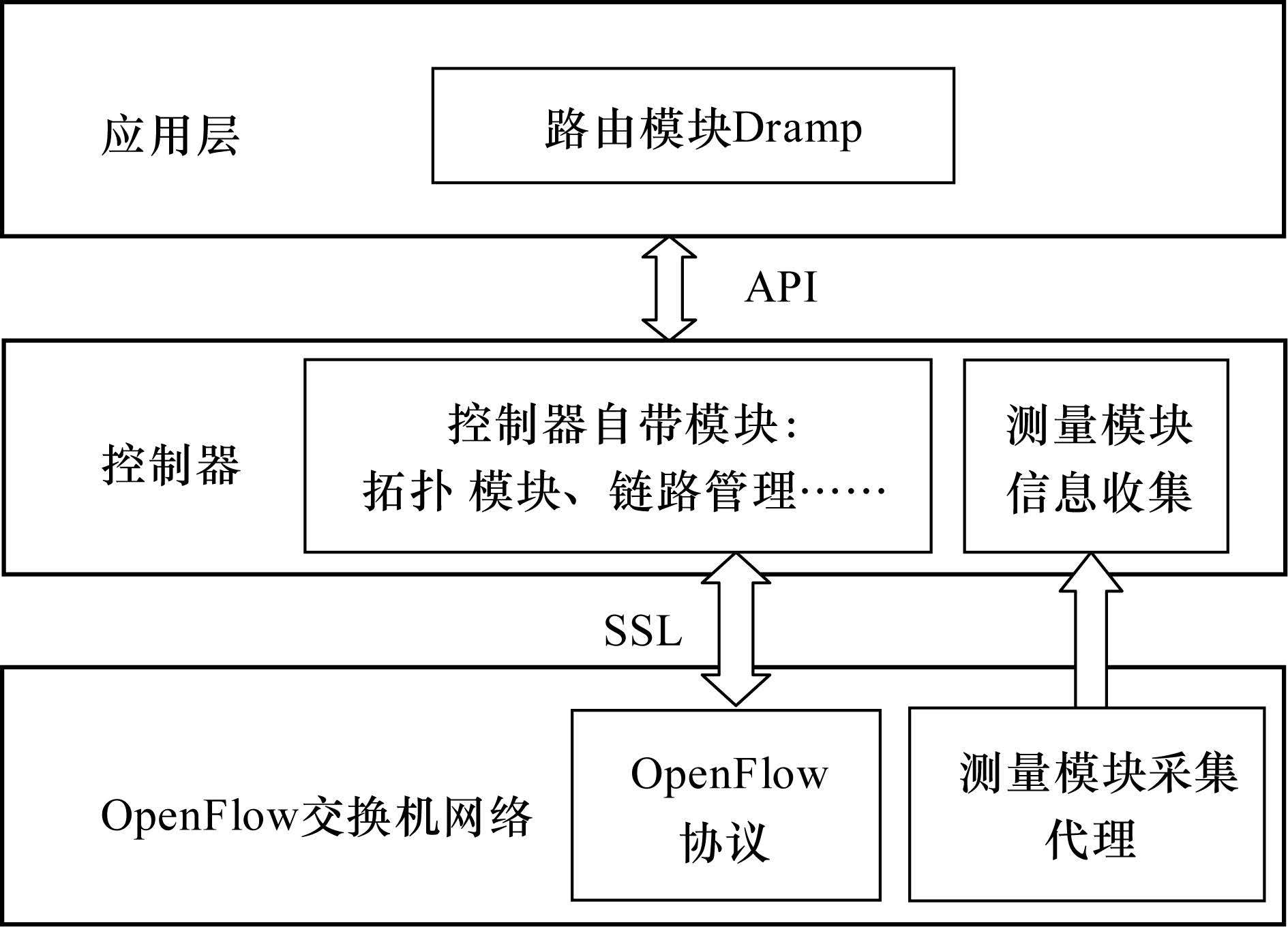 2.3 控制器模块控制器是SDN结构中的核心组件,主要负责从测量模块获取信息,并通过路由模块的计算形成路由策略下发到网络中间节点交换机,交换机则根据流表进行转发。由于控制器的重要性,需要做到控制器的冗余备份,结构设计中一般部署主、从2台控制器,主控制器工作正常情况下,从控制器只负责接受与主控制器同样的信息并存储,只有在主控制器出现故障时,从控制器才正式接管主控制器的工作。本文基于Dramp的SDN/OF结构中控制器主要完成以下任务: 1) 收集测量信息并形成全局视图,提供给路由模块进行计算; 2) 形成路由转发策略并生成流表下发到各个节点交换机。