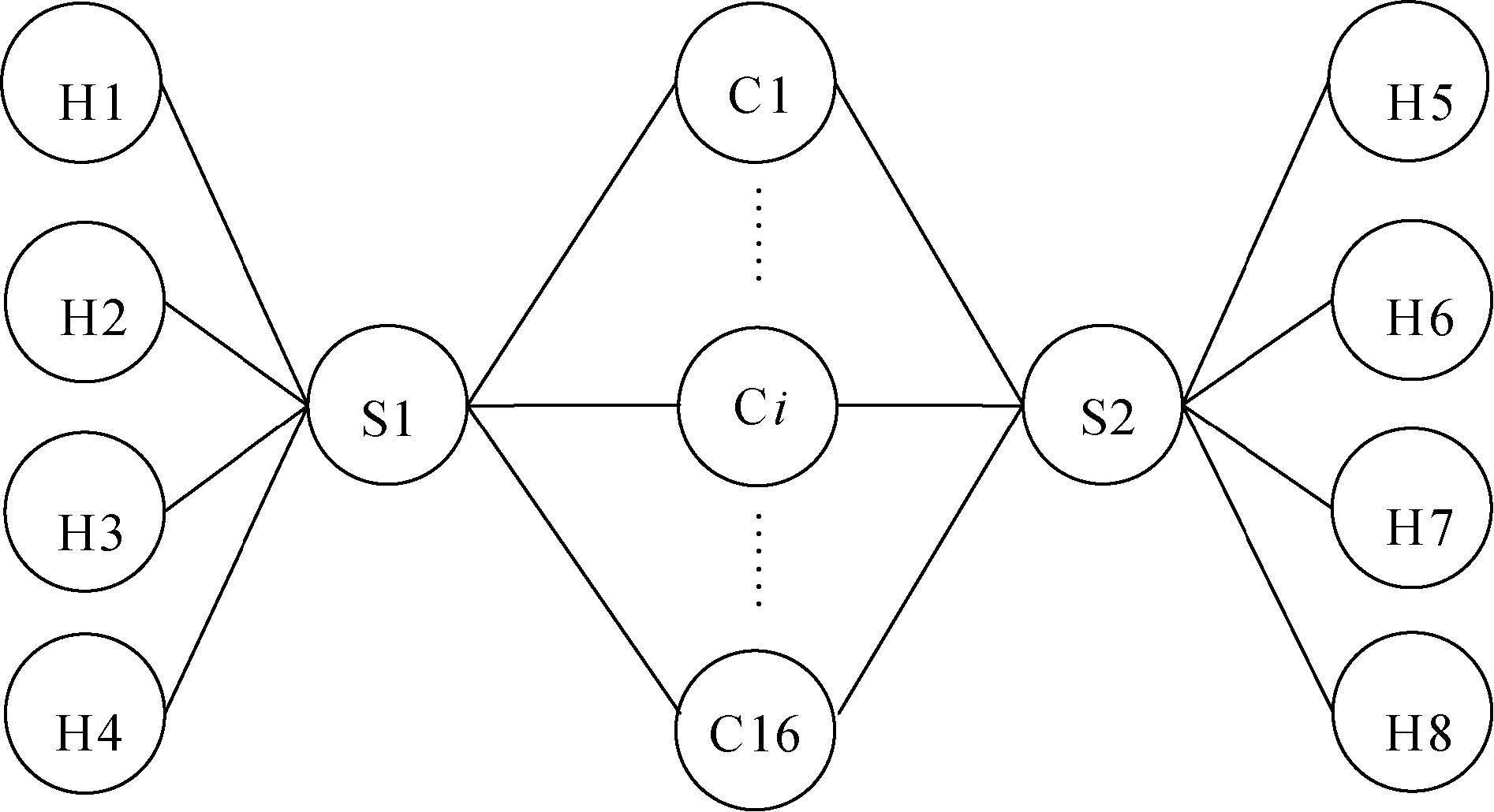 为了更清晰地显示流量传输路径,本文将图2抽象成图3的实验拓扑图。在实验拓扑中,交换机均采用能支持OpenFlow协议的OVS(open v-switch)虚拟交换机[11] ,S1、 S2表示2台接入层交换机,相当于ToR架构中的架顶交换机,分别属于2个不同的POD。S1和S2分别接入4台主机,即H1到H4、 H5到H8; C1到C16表示16台核心层交换机。由于FatTree拓扑结构的特性以及链路带宽的统一规划,S1到S2总共有16条等价路径(为了拓扑的简洁,忽略掉链路上汇聚层交换机的图示),实际上S1、 S2都只能选择4条不相交等价传输路径,本次试验随机选取其中3条用作流量均衡,真实地模拟数据流竞争带宽的场景。