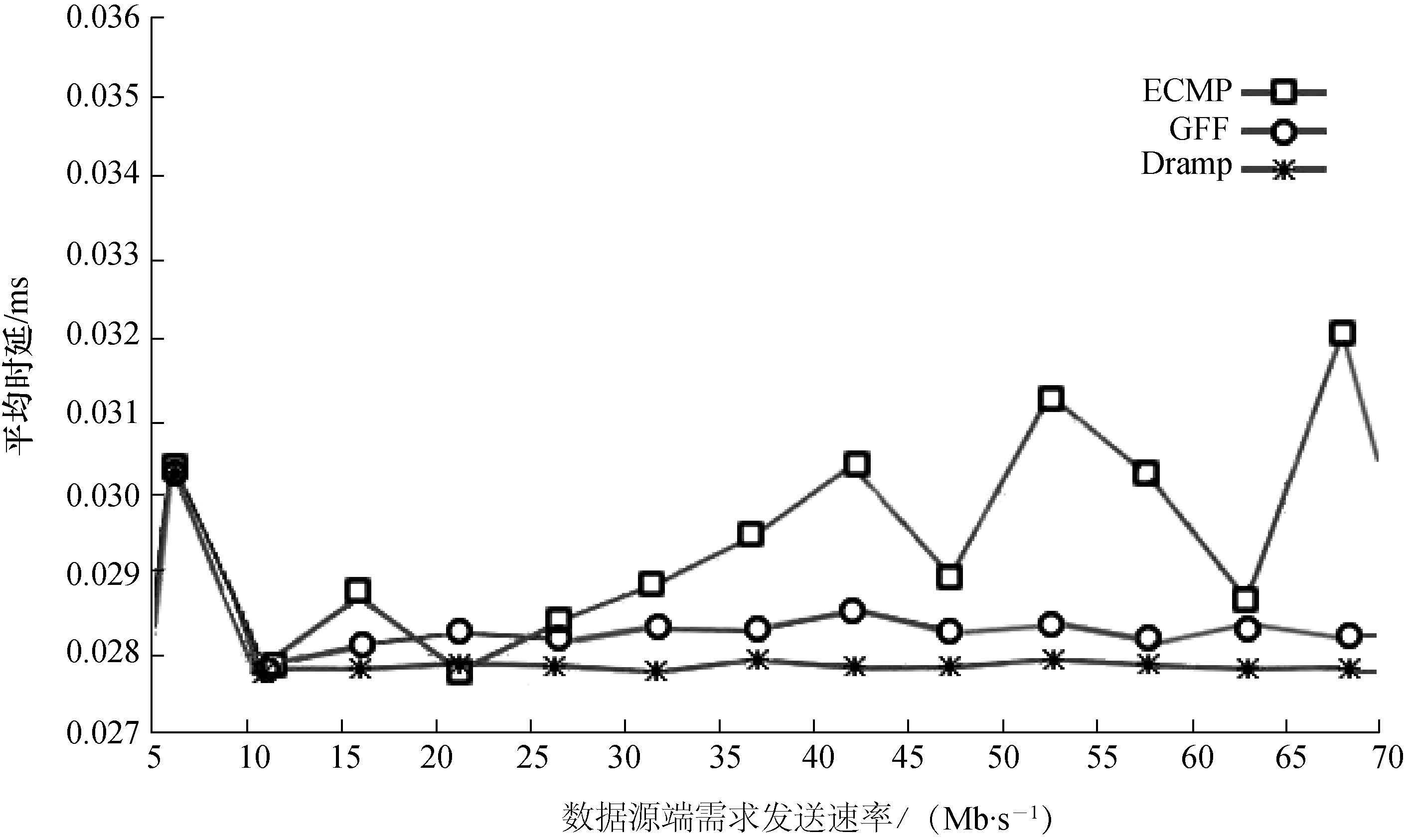 时延迅速回落。当发送速率在6 ~31 Mb/s时,3种路由算法时延表现相当,说明这一阶段网络链路状态良好,无拥塞链路出现。当发送速率超过32 Mb/s时,ECMP时延开始增大; 当发送速率大于35 Mb/s时,ECMP时延产生较大抖动,网络性能开始下降。相比ECMP的时延抖动,Dramp的时延基本无抖动,GFF的时延则介于两者之间。本次实验现象符合预期,由于ECMP本身的设计,当某条链路负载加重时并不能将数据流切换到链路负载较轻且未发生拥塞的路径上,从而使节点交换机缓存队列增加,数据包交付时延增大,有丢包现象产生,网络性能下降; 而GFF只有在链路中产生大流的时候才被触发; 相比之下,Dramp则能将时延控制在有效范围内,总体平稳无抖动产生,体现出一定的优越性。