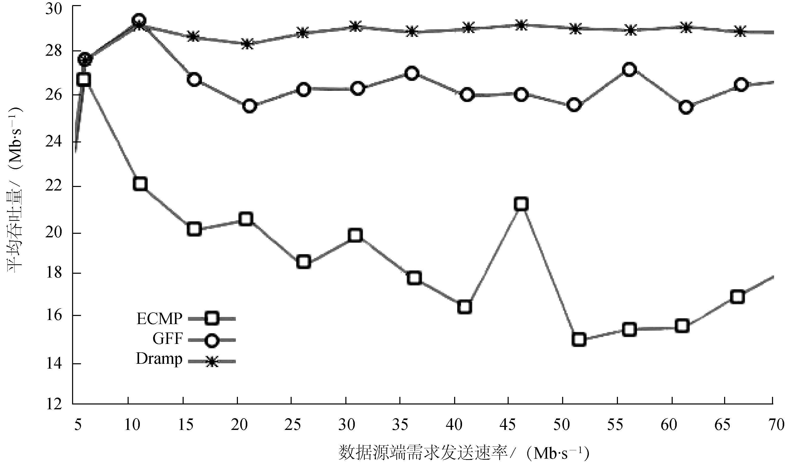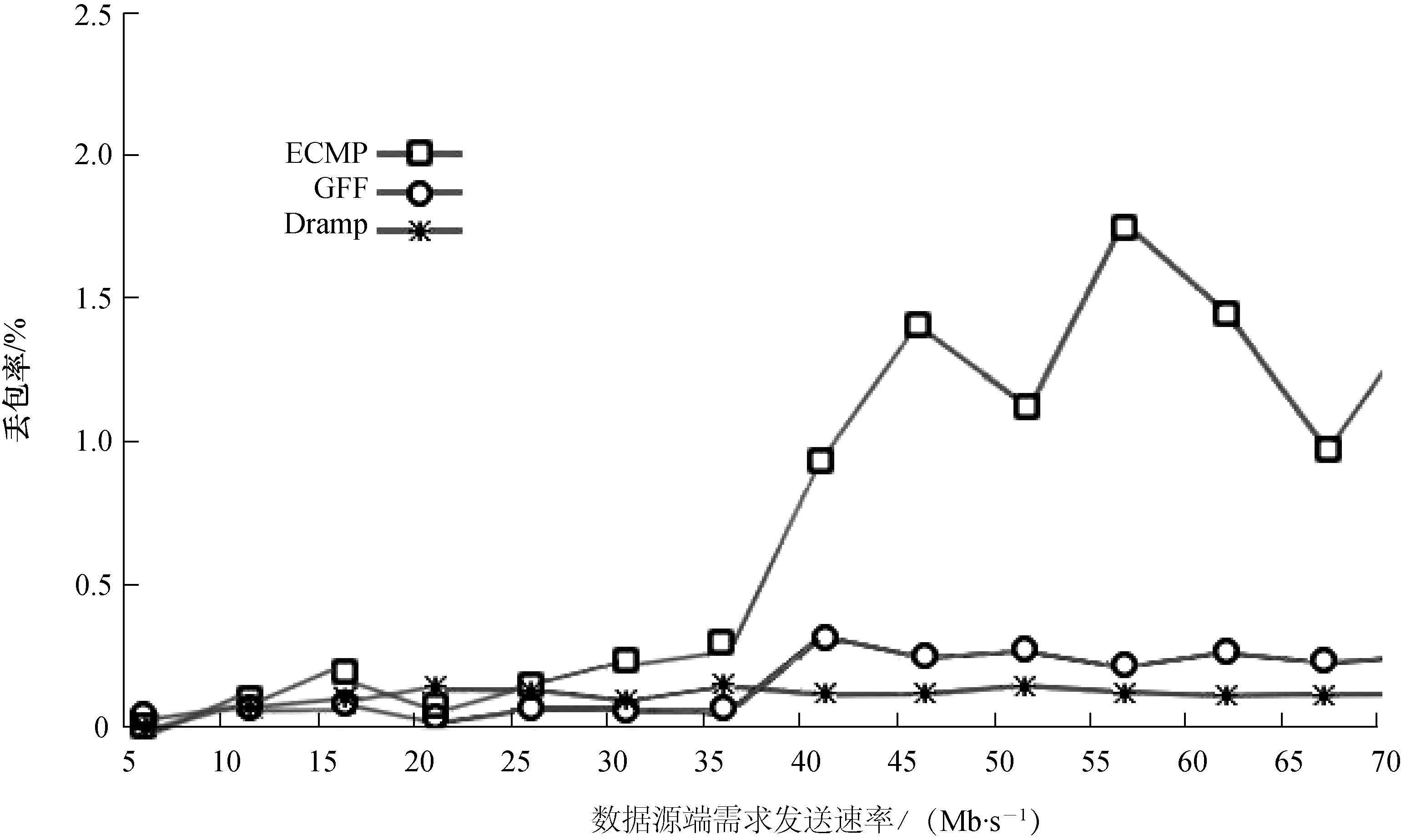 Dramp丢包率的测试是在同一实验环境下进行的,结果如图5所示。当数据源端发送速率低于5 Mb/s时,3种策略均无丢包产生; 当发送速率在5 ~35 Mb/s时,3种策略表现相当,但是当发送速率大于35 Mb/s时,Dramp的丢包率仍然平稳,而ECMP和GFF的丢包率均开始增加,在发送速率为56 Mb/s时刻,ECMP的丢包率达到峰值。GFF则在发送速率为42 Mb/s时,丢包率有所下降并保持平稳。在节3.2.2对时延的测试中,当发送速率大于35 Mb/s时,ECMP的时延产生较大抖动,网络性能开始下降,其原因是随着负载增大,链路出现拥塞时丢包率开始增加,当数据源端进入TCP拥塞避免时丢包率又开始下降,如此反复从而造成ECMP丢包率抖动。