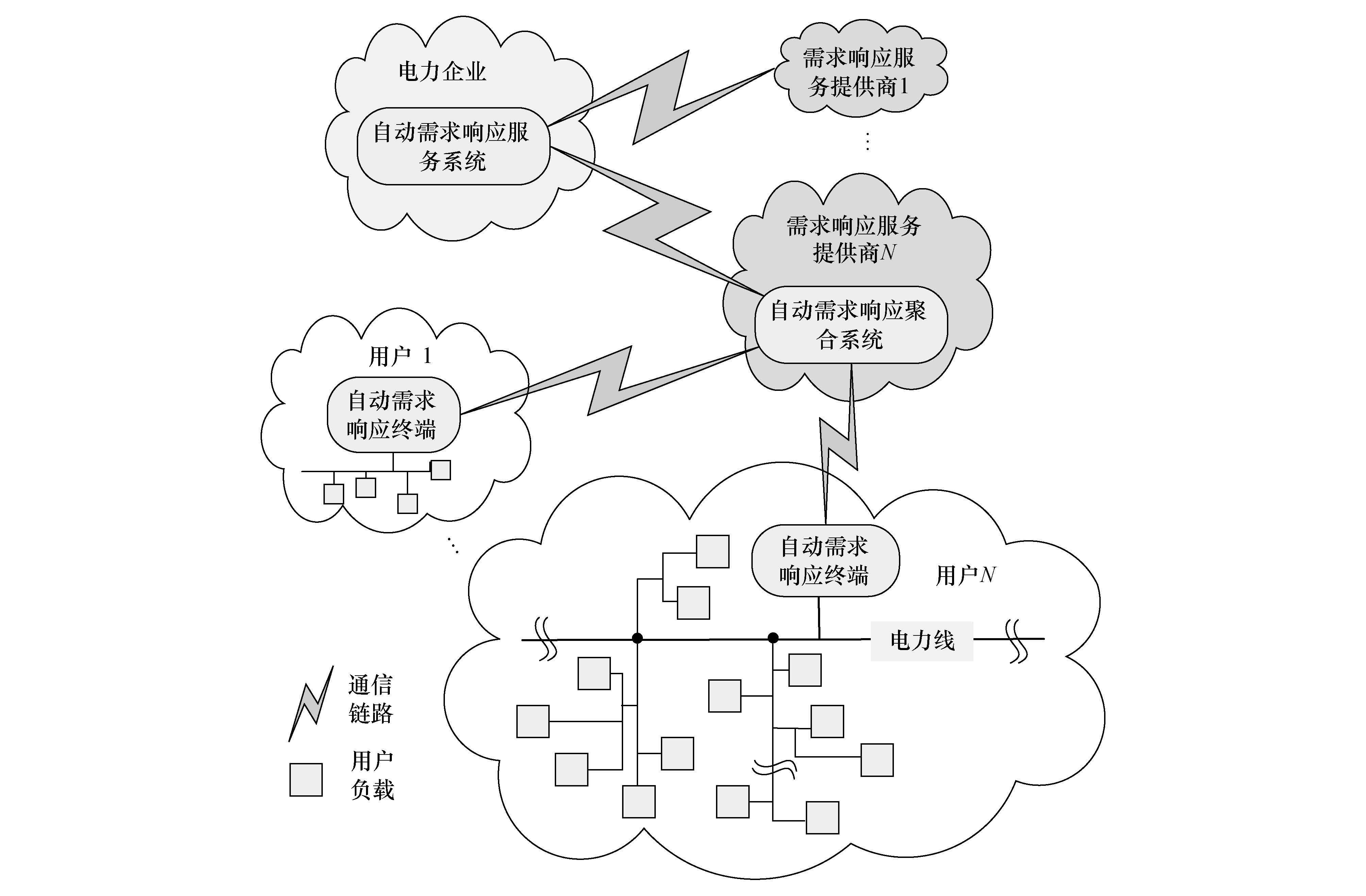 1 自动需求响应系统图1给出了自动需求响应系统的实现架构图,主要包括电力企业、需求响应服务提供商和用户这3大核心参与主体,三者分别通过自动需求响应服务系统、自动需求响应聚合系统和自动需求响应终端进行相互联系[7]。以用户侧为例,由于用电负载已由电力线接入电力系统,同时兼顾到实现成本和通信效率等方面,而且服务范围不同,用户侧通常具有不同的负载规模和通信拓扑[8, 9],因此使用HNPLC技术完成用户侧的自动需求响应服务是较好的选择。