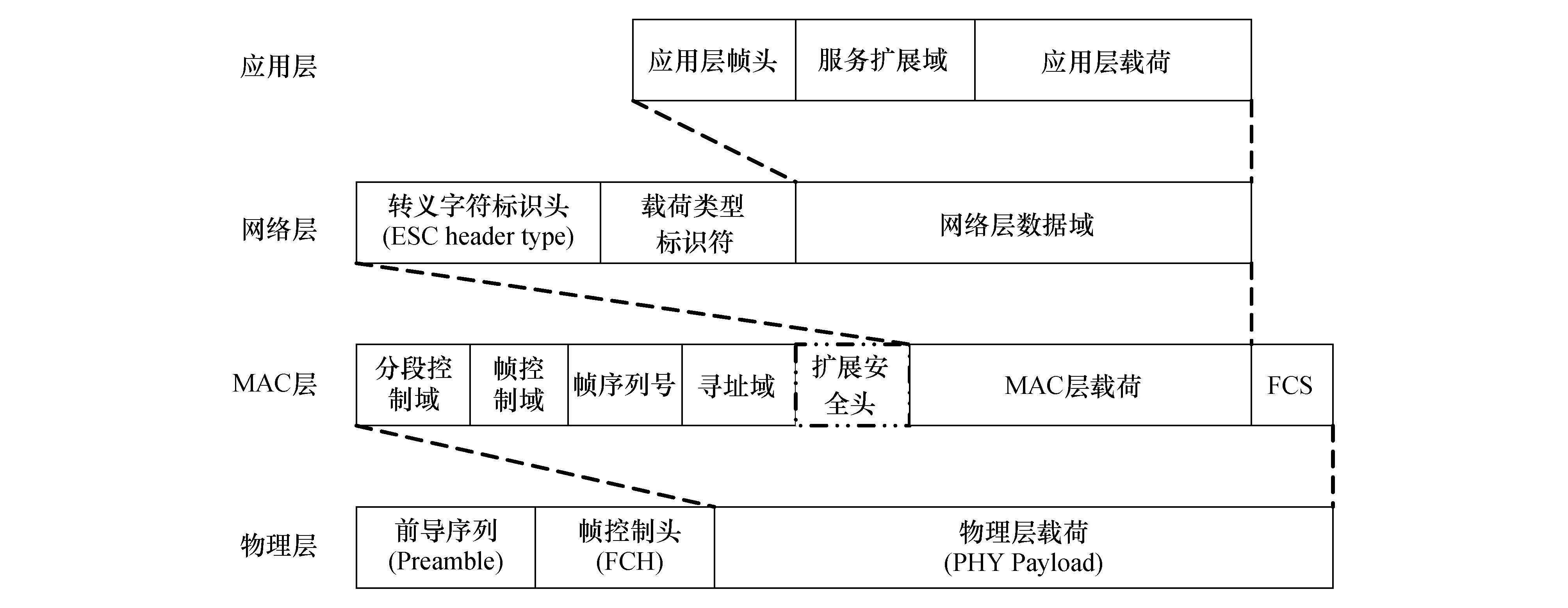 设计的面向自动需求响应的HNPLC各层数据的帧结构如图2所示。其中,考虑到互联网传输的扩展需求,所设计的数据帧还在网络层使用了IP协议的转义字符标识头[10],进而确保了HNPLC系统与IP协议的兼容性。
