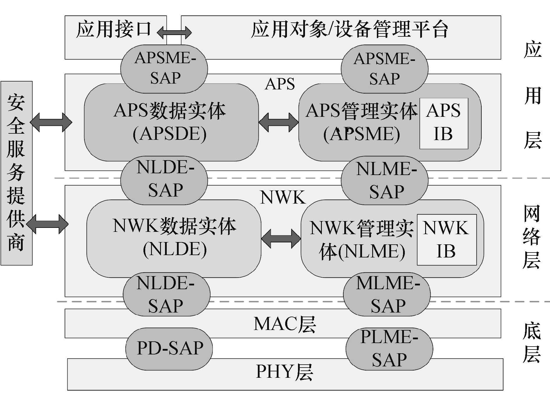 3.1 面向自动需求响应的HNPLC应用层协议架构图3是所设计的面向自动需求响应的HNPLC应用层协议架构,也给出了应用层与下面各层的架构关系。其中: APS表示应用支持子层,APSME表示管理实体,APSDE表示数据实体,SAP表示服务接入点,IB表示信息库,NWK表示网络层,NLME表示NWK管理实体,NLDE表示NWK数据实体,MLME表示MAC层管理实体,MLDE表示数据实体,PD表示物理层数据,PLME表示PHY管理实体。从应用层架构部分可以看出,该应用层包括APS、 应用接口、制造商或设备使用的应用对象/设备管理平台[11, 12]这3大部分。APS定义了分组的通用服务类,一方面完成所需服务数据的组包和管理,另一方面也提供与下层网络层的交互接口。APS使用APSDE和APSME这2个实体完成相应服务。APSDE通过APSDE-SAP提供数据传输服务; APSME通过APSME-SAP提供管理服务并维护管理对象数据库。应用接口完成具体应用数据与APSDE的交互任务,并与应用对象/设备管理平台协同工作,共同提供所需的用户服务。安全服务提供商则为应用层和网络层提供安全支持服务。