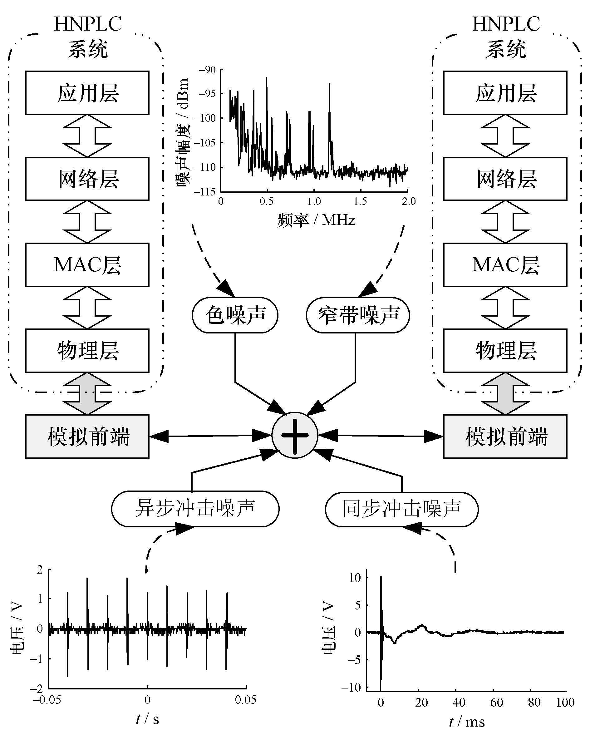 4.1 仿真平台为确保仿真验证的真实和有效性,对所搭建仿真实验平台中的HNPLC节点功能进行跨层实现,其中应用层设计见节3,网络层、 MAC层和PHY层使用课题组已有的研究成果[2, 3, 4],这里限于篇幅不再赘述,仅给出仿真平台的单跳传输示意图,如图5所示。仿真中使用的HNPLC网络拓扑是依据实验室的实际布线而构建的,其电力线信道信息采用了实测的统计特性[15],以确保仿真结果真实地反映HNPLC网络的实际传输效果。