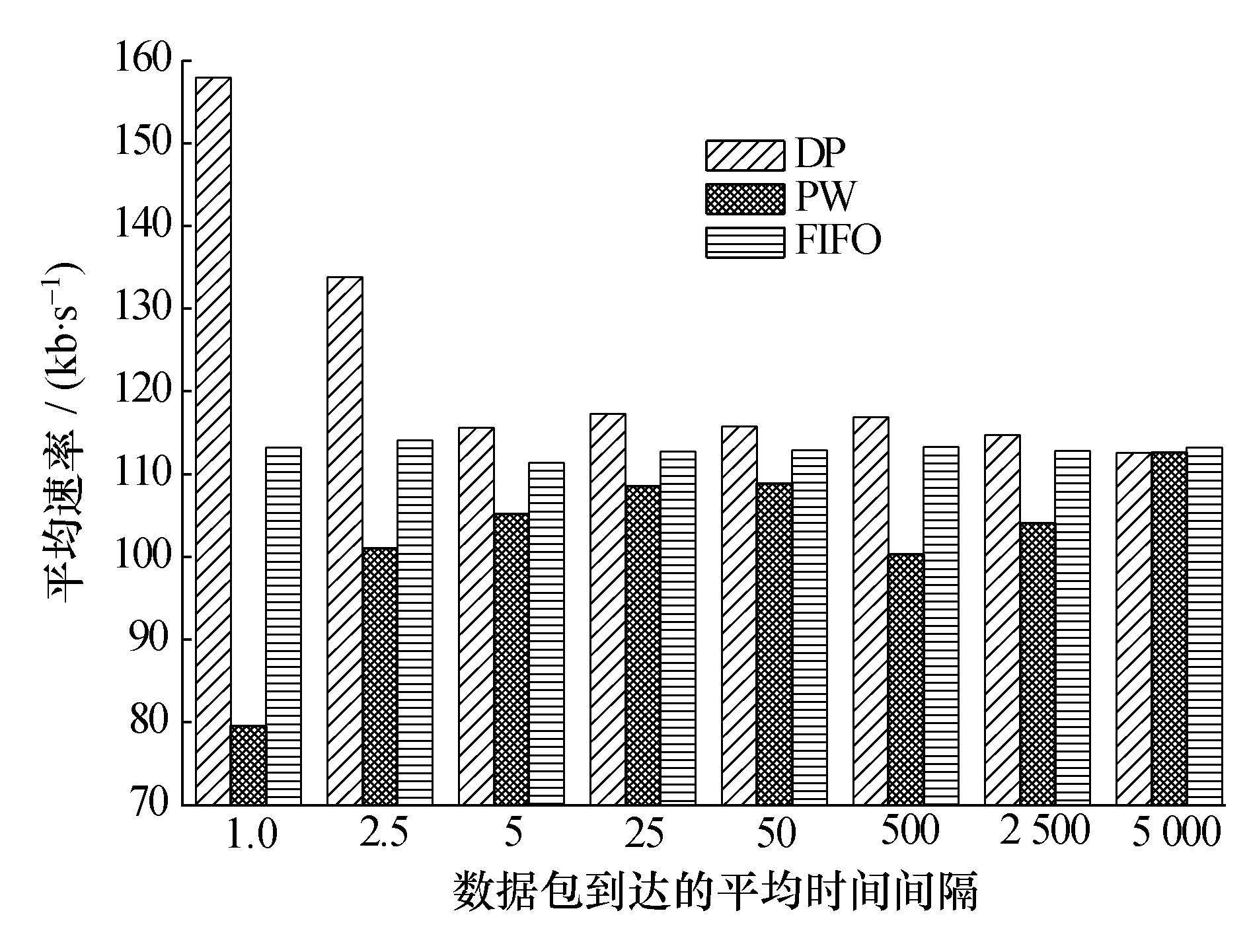 搭建的实验网络中,各节点的应用层服务响应机制分别使用所提的基于动态优先级的服务响应机制(dynamic priority,DP)和2种传统的单条件服务响应机制——单纯依据优先级权重(priority weight,PW)和先到先传(first in first out,FIFO)的服务响应机制。仿真实验有效验证了所设计的应用层架构的合理性和有效性,下面分别从网络的平均传输速率、丢包率和服务传输比例这3方面考察应用层核心的服务机制对网络性能的影响,进而验证所提的基于动态优先级的服务机制的优越性。