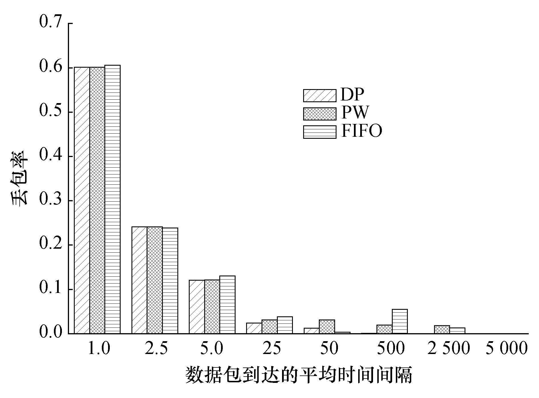 3种服务响应机制下网络的丢包率如图7所示。当各节点的业务量处于饱和或相对繁重的状态时,3种服务响应机制均具有较高的丢包率。随着节点业务量的减少,3种机制下的网络丢包率均呈下降趋势。其中,基于动态优先级的服务响应机制由于对缓存数据包的各种参数特征进行了综合把握,因此能较好地协调传输顺序,具有最低的丢包率,且丢包率随业务量的减少而最早降为0; 其他2种机制由于随机到达的数据包的类型和包长不同,其丢包率会在小范围内出现一定波动,其变化趋势仍满足丢包率随平均到达时间间隔的增大而减小的一般规律。当节点数据包的平均到达时间间隔足够大时,网络较为空闲,因此3种机制下的网络丢包率均降为0。
