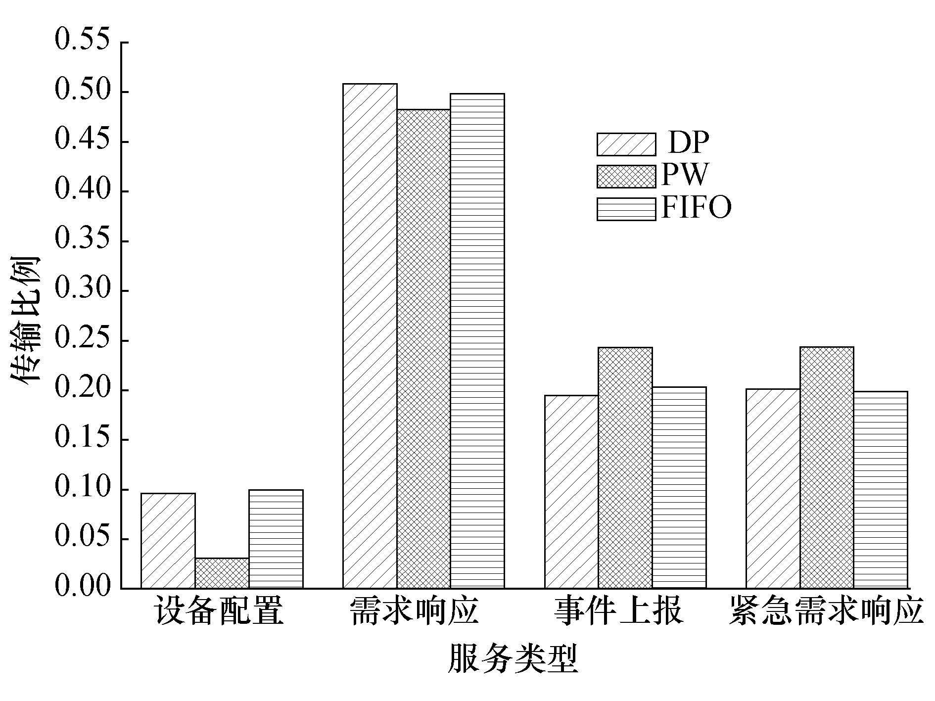 由于仿真参数中对各类服务数据包均规定了响应时间上限,即各类数据包均满足快速响应需求,因此本文用较长仿真时间内各类数据包的传输比例来考察各应用层响应机制对不同服务类型的服务响应情况。该指标一方面反映了各机制对各类数据的服务质量,另一方面也体现了仿真实验的准确性,并从原理上诠释了各服务机制性能表现的产生根源。图8给出了多次Monter Carlo仿真得到的传输比例的平均值,其中: 先到先传的服务响应机制的数据包传输比例与仿真初始化时设置的数据包产生比例相一致,即设备配置、需求响应、事件上报和紧急需求响应服务的传输比例分别为10%、 50%、 20%和20%; 单纯依据优先级权重的服务响应机制更倾向于为具有高优先级权重的数据包提供服务; 基于动态优先级的服务响应机制则能最大限度地选择效率相对较高的需求响应数据包来提供服务,满足双向互动的需求响应服务对网络传输效率和丢包率的要求。
