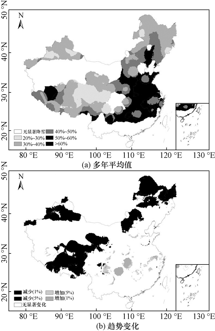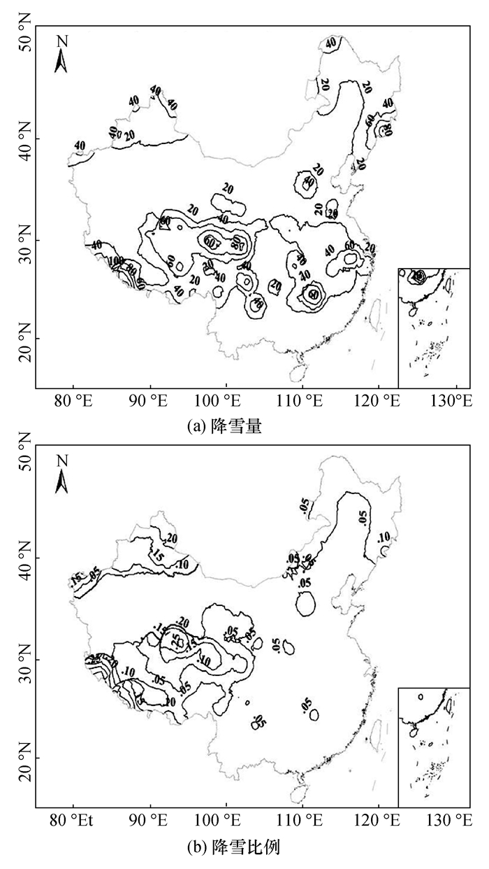 3 结 论本文基于中国743个国家气象站1956—2010年气象数据,采用考虑温度、相对湿度和海拔等因素的经验判别式来区分日降雨和降雪事件,从年、月、日不同尺度来分析过去50 a中国的降雪特征变化,探究其对水文过程的影响,得到的主要结论有: