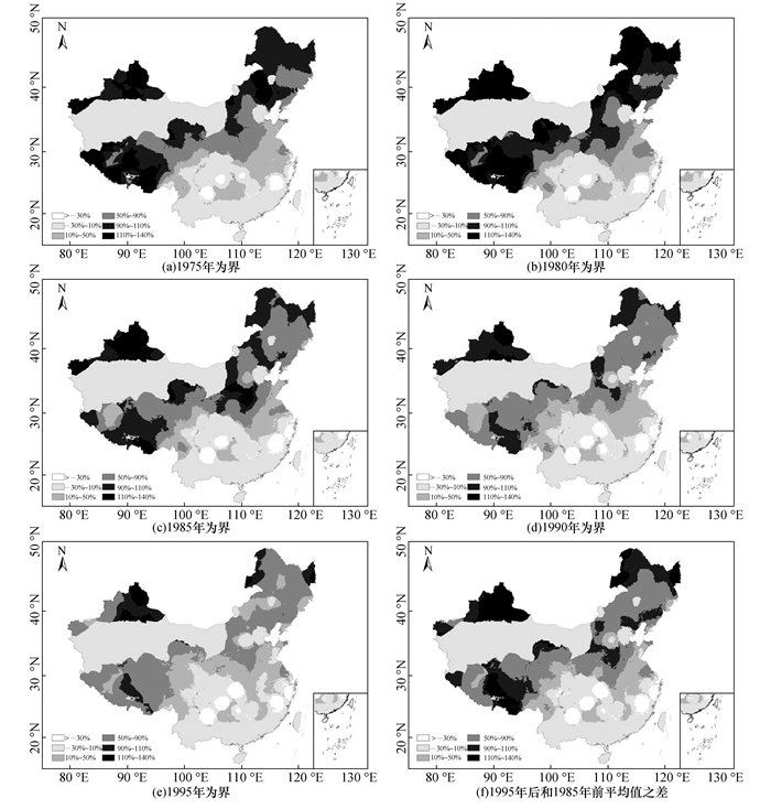 为了进一步认识降雪的代际变化,识别年降雪在空间上是否有阶跃、突变行为,将研究阶段划分为前后2个时段,计算这2个时段差值与多年平均的比值,如图 3所示。可以看出,以1980年为界(图 3b),前后2阶段平均降雪量的变化最为显著,并且随着分界时间的前移(图 3a)或者推后(图 3c,图 3d,图 3e),所得到的前后2个阶段平均降雪量差值均变小; 同时,1995年之后与1985年之前的多年平均的差值(图 3f)也显示了一定,但并不显著的差距。说明了中国过去50 a总体呈增加趋势的年降雪量,在80年代达到较高值,到1995年左右回落,但仍然大于1980年之前的多年平均。在全国范围内降雪这种“少—多—少”的代际变化模态,在青藏高原[19]以及青海—西藏[20]积雪等变化情况是一致的,其中亚洲季风环流转变[21]被认为与之有一定的关联。在东北地区,年总降水量变化也呈这种代际变化,松花江和辽河流域近50 a中最大的10 a降水量为1986—1995年平均值[15],说明年降雪的代际变化与东北地区总体的干湿变化也是一致的。而中国径流变化年份阈值也呈现相似模态[22],多年平均降雪量的变化对相关流域径流变化的贡献需要进一步开展研究。
