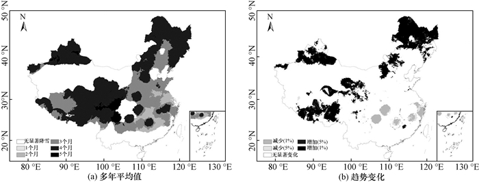 如图 4所示,在东北、天山北部及青藏高原地区多年平均的降雪月份数多为4个月,并且在过去的50 a有显著的增加趋势,这些地区首次出现降雪月份的多年平均值为11月份,其中唐古拉山脉地区为10月份。华北地区降雪月份主要为12月份至次年2月份,降雪月数的趋势变化不明显; 长江中下游地区降雪集中在1—2月份,降雪月份数有减少趋势。