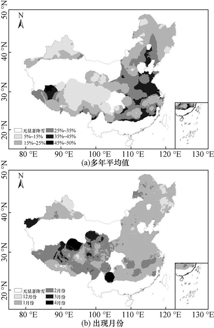| 图 6 日最大降雪占年总降雪之比的多年平均值及出现月份 |