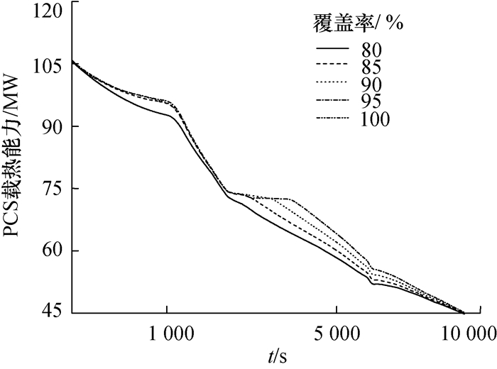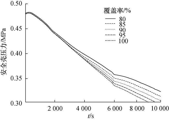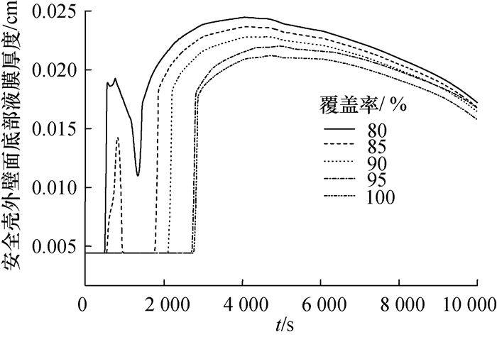 考虑到钢制安全壳外壁面环境条件对液膜覆盖影响的不确定性,选取了不同的液膜覆盖率(0.80、0.85、0.90、0.95、1.0)展开分析,以研究不同液膜覆盖率对安全壳峰值压力和PCS载热能力的影响。表 3给出了不同液膜覆盖率下的安全壳峰值压力。图 11-13给出了不同液膜覆盖率条件下主要参数的变化曲线。结果表明:安全壳峰值压力对液膜覆盖率不敏感,最大差异仅为1.9 kPa,约0.4%;液膜覆盖率越高,PCS载热能力越强,且事故后期安全壳压力下降较快。液膜覆盖率越高,液膜厚度越薄,由于液膜的蒸发使得钢制安全壳外壁面的下部存在的干涸期越长。