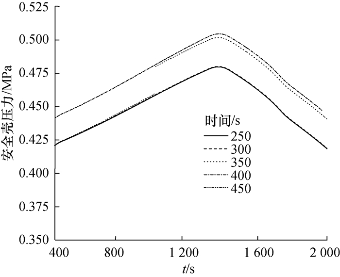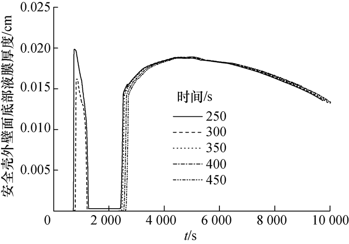 为了评价形成有效液膜覆盖时间对安全壳峰值压力的影响,假设了不同的PCS给水启动延迟时间(250、300、350、400、450 s)展开分析。表 4为不同PCS给水启动时间下的安全壳峰值压力。图 14-16给出了不同PCS给水启动时间下主要参数的变化曲线。结果表明:形成有效液膜覆盖的时间对安全壳峰值压力有较大的影响,液膜有效覆盖形成的时间越晚,安全壳峰值压力越高,最大差异为7.4 kPa,约1.5%。但过早形成液膜覆盖也会导致事故初期部分冷却液膜未完全蒸发而损失部分带热能力。