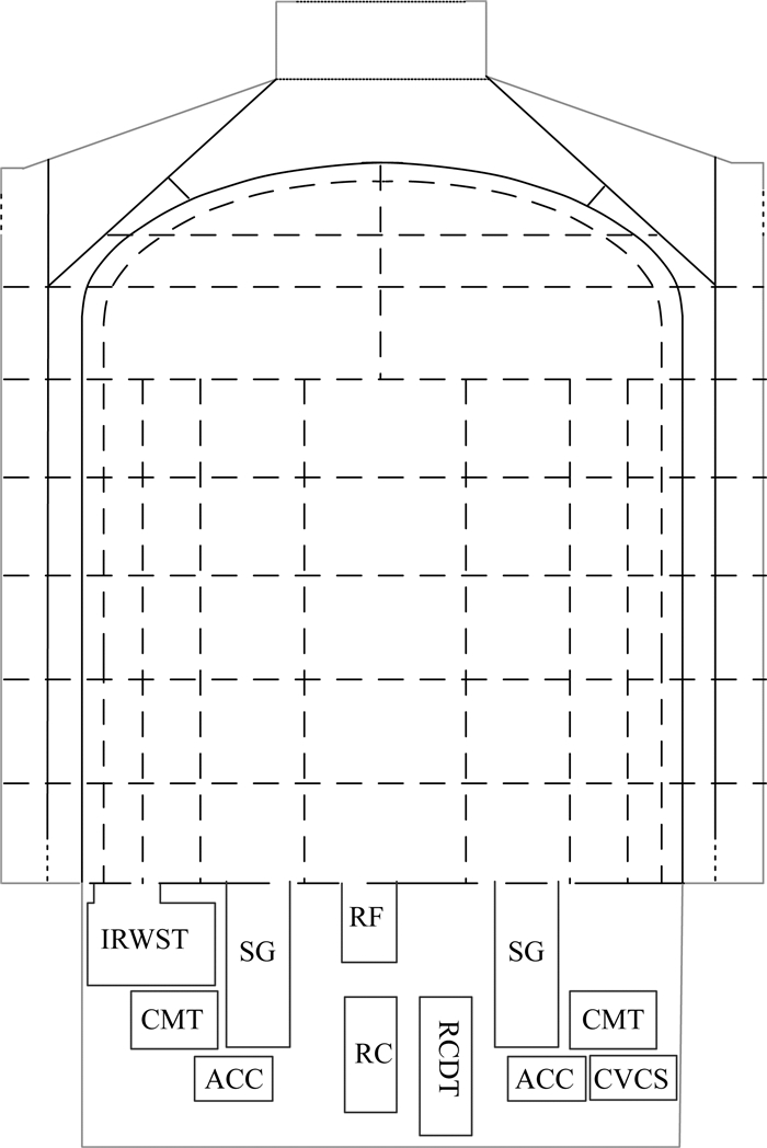 从整体上讲,AP1000安全壳以操作平台为界分为操作平台以下的隔间和操作平台以上的大空间。在分析模型的节点划分上,充分考虑了操作平台以下隔间布置的复杂性和非能动安全壳冷却系统的特性,以反映在事故情况下安全壳内的传质传热过程。对于操作平台以下的隔室空间划分,与安全壳内隔间布置保持一致,对于操作平台以上的大空间,径向划分为4环,轴向划分为8层[15]。图 2为AP1000安全壳节点划分示意图。