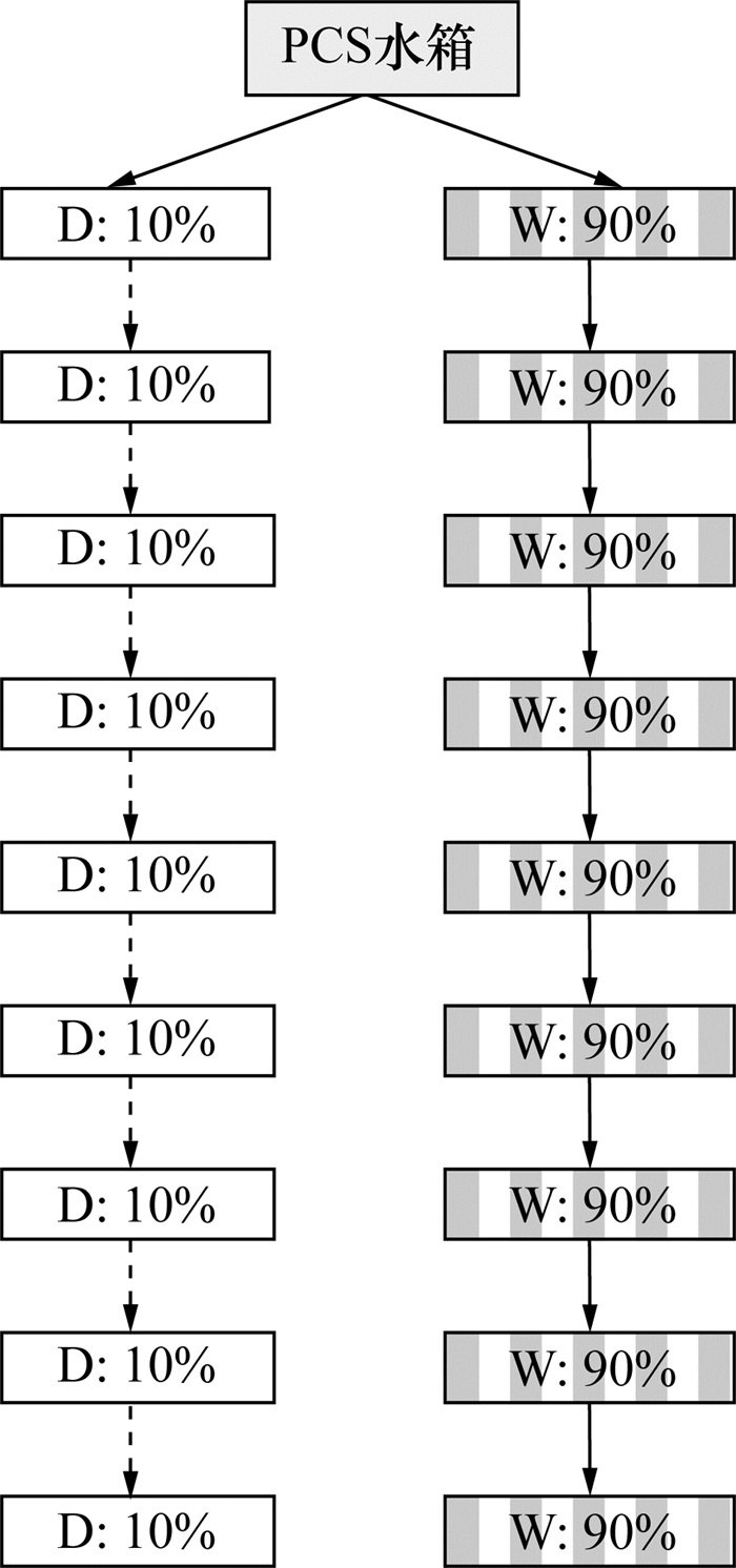 PCS是AP1000核电厂重要的专设安全设施,其最主要的功能是在安全壳内发生冷却剂丧失或主蒸汽管道破裂事故时,导出安全壳内热量,降低安全壳的温度和压力,降低安全壳大气和外部环境的压差,限制事故后放射性物质的释放。图 3为采用液膜跟踪模型模化PCS的节点划分。