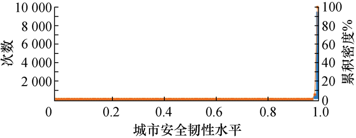 由于每次模拟结果具有随机性,为准确反映城市系统应对6级地震的安全韧性水平,通过Monte Carlo方法在6级地震情景下进行10 000次模拟计算,城市安全韧性平均值为0.994,最小值为0.961,最大值为0.996,得到城市安全韧性分布直方图及累积密度曲线如图 4所示。