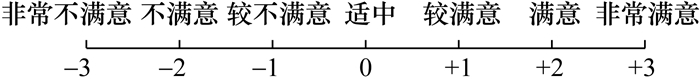 对各航站楼旅客主观评价回访采用问卷调研方式。问卷涉及了乘客对航站楼内热环境、空气品质、光环境、声环境、空间感受、便携性等的满意度评价以及关心因素和最不满意的因素排序。其中满意度评价采用的刻度标尺为“-3”—“3”,分别代表了“非常不满意”—“非常满意”,如图 1所示。